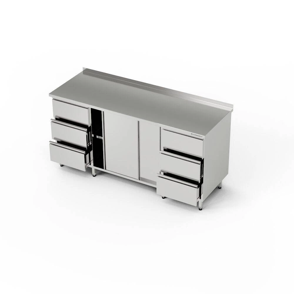 Nerezový pracovní stůl se skříňkou a 2 bloky po 3 zásuvkách 240x60x85 cm
