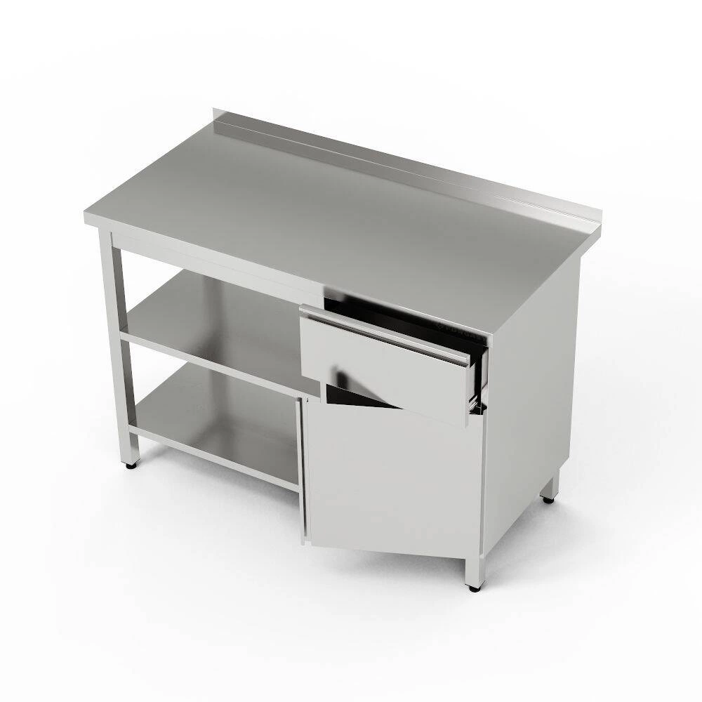 Pracovní stůl o rozměrech 100x60x85 cm se skříňkou s otevíracími dvířky, zásuvkou a 2 skříňkami. Skříňka se zásuvkou dlouhou 40 cm a širokou 60 cm (hlubokou) umístěnou na pravé straně. Uvnitř skříňky je półka. Na levé straně dvě skříňky. Stół z nerezové oceli J4.