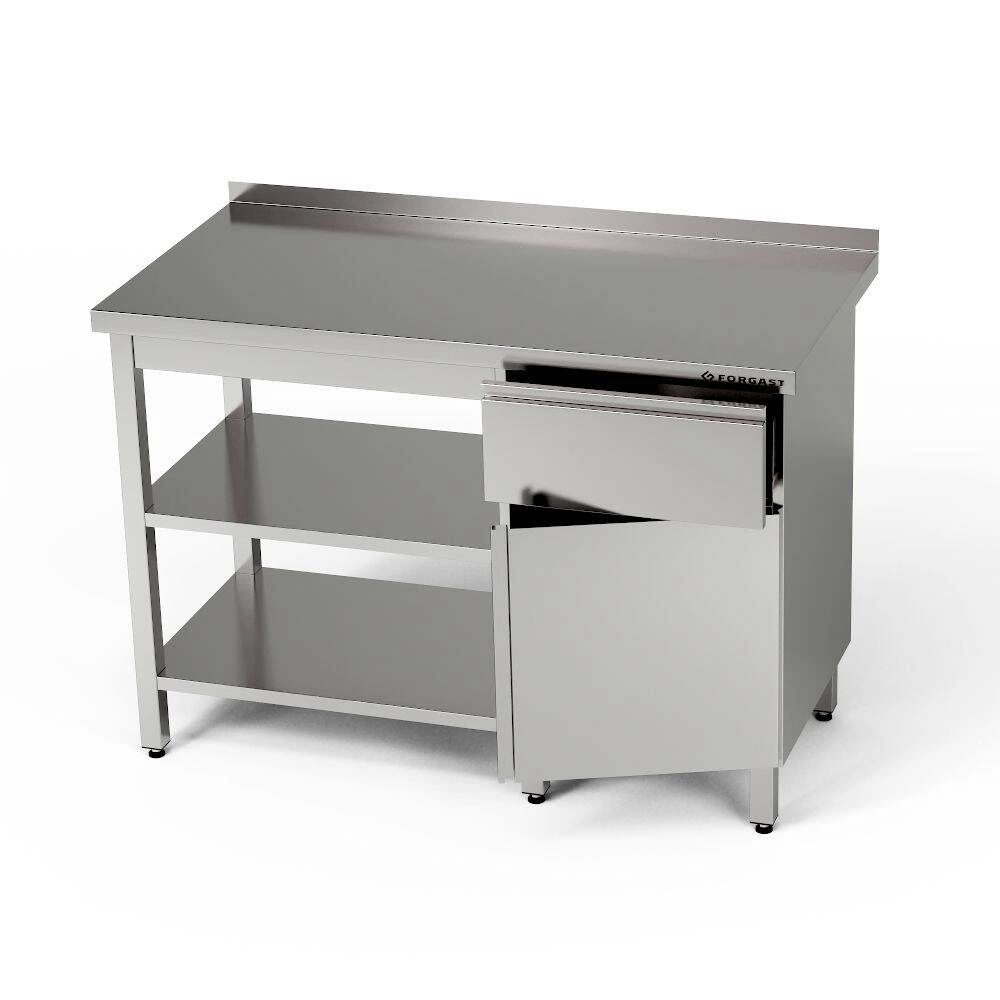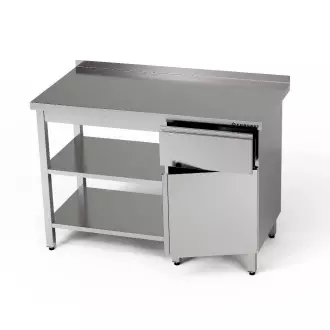 Pracovní stůl o rozměrech 100x70x85 cm se skříňkou s otevíracími dvířky, zásuvkou a 2 skříňkami. Skříňka se zásuvkou dlouhou 40 cm a širokou 60 cm (hlubokou) umístěnou na pravé straně. Uvnitř skříňky je półka. Na levé straně dvě skříňky. Stół z nerezové oceli J4.