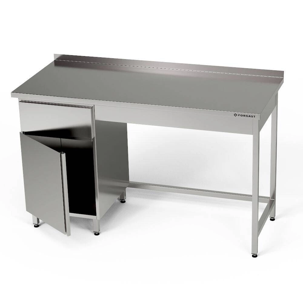 Pracovní stůl o rozměrech 150x70x85 cm se skříňkou s otevíracími dvířky a zásuvkou. Skříňka se zásuvkou o délce 40 cm a šířce (hloubce) 70 cm umístěná na levé straně. Uvnitř skříňky je półka. Stół z nerezové oceli J4.