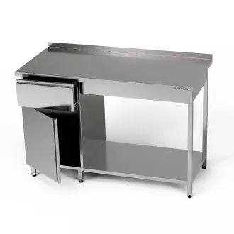 Pracovní stůl o rozměrech 210x60x85 cm se skříňkou s otevíracími dvířky, zásuvkou a pó³. Skříňka se zásuvkou dlouhou 40 cm a širokou 60 cm (hlubokou) umístěnou na levé straně. Uvnitř skříňky je półka. Na pravé straně stolu spodní skříňka. Stůl je vyroben z nerezové oceli J4.