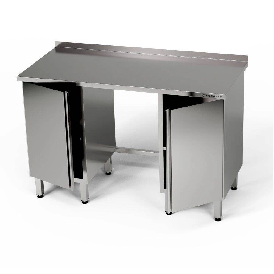 Pracovní stůl se dvěma skříňkami o rozměrech 170x60x85 cm z nerezové oceli J4. Skříňky jsou umístěny na pravé a levé straně. Ve skříňkách jsou półki.