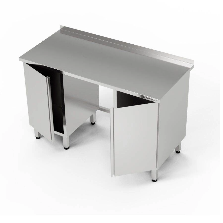 Pracovní stůl se dvěma skříňkami o rozměrech 280x60x85 cm z nerezové oceli J4. Skříňky jsou umístěny na pravé a levé straně. Ve skříňkách jsou półki.