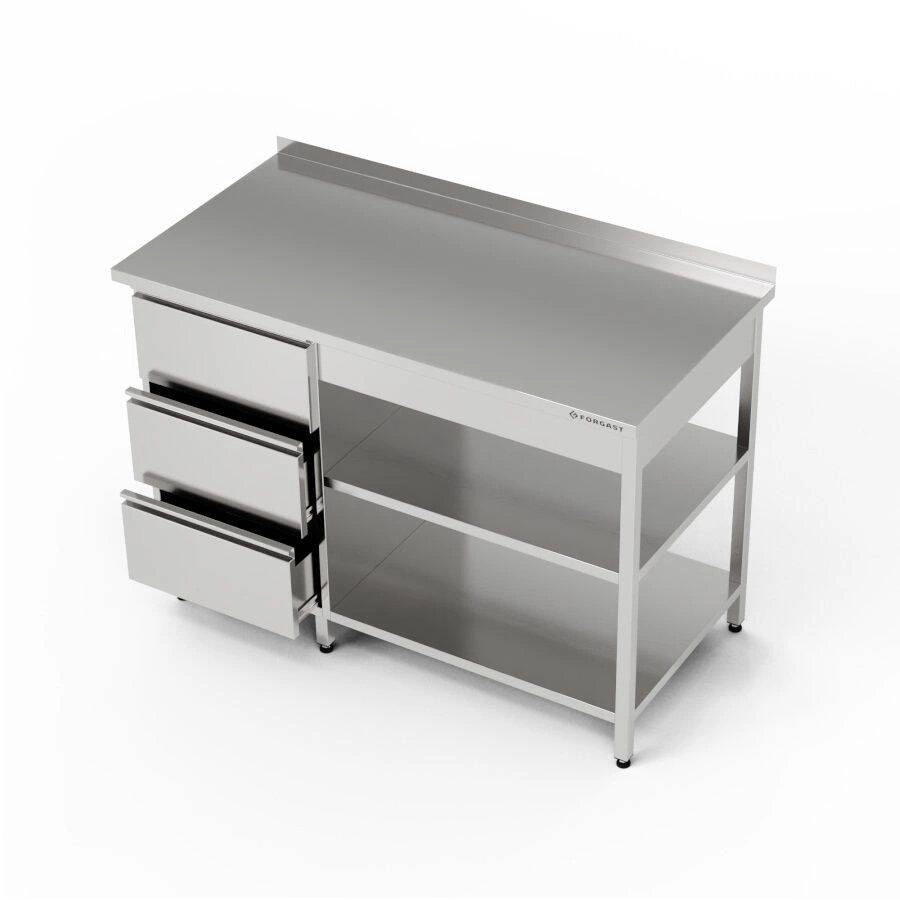 Nerezový pracovní stůl s blokem zásuvek a dvěma policemi 220x60x85 cm