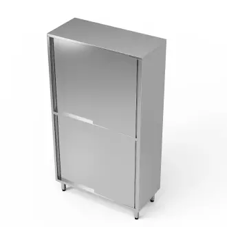 Průchozí dělená skříň o rozměrech 100x70x180 cm z nerezové oceli J4. Ve skříni jsou 2 pólavice. Posuvné dveře.