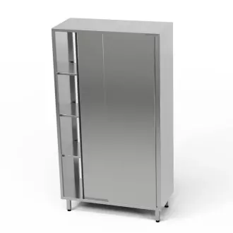 Průchozí šatní skříň  o rozměrech 110x50x180 cm z nerezové oceli J4. Skříň má 3 pólavice. Posuvné dveře.