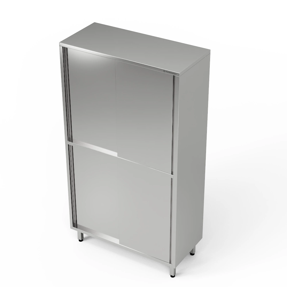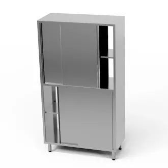 Průchozí dělená skříň o rozměrech 90x50x180 cm z nerezové oceli J4. Ve skříni jsou 2 pólavice. Posuvné dveře.