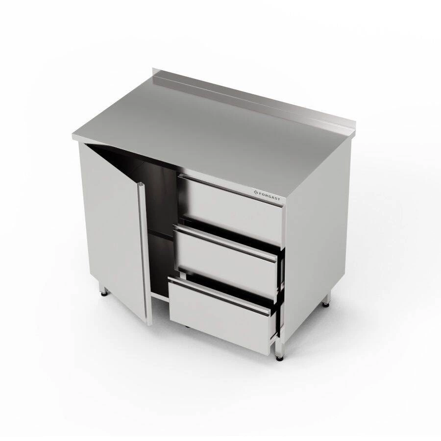Pracovní stanice o rozměrech 90x60x85 cm s blokem 3 zásuvek a skříňkou s otevíracími dvířky. Uvnitř skříně je pólavice. Vyrobeno z nerezové oceli J4. Skříňku lze umístit na levou nebo pravou stranu. Rozměry zásuvky v bloku 3 zásuvek: 46,5x21,5x44/13 cm.