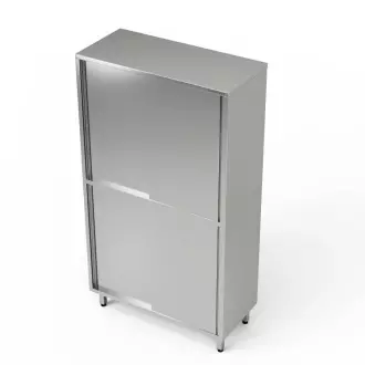 Horizontálně dělená úložná skříň o rozměrech 80x60x200 cm, z nerezové oceli J4. Ve skříni jsou 2 lavice. Posuvné dveře.