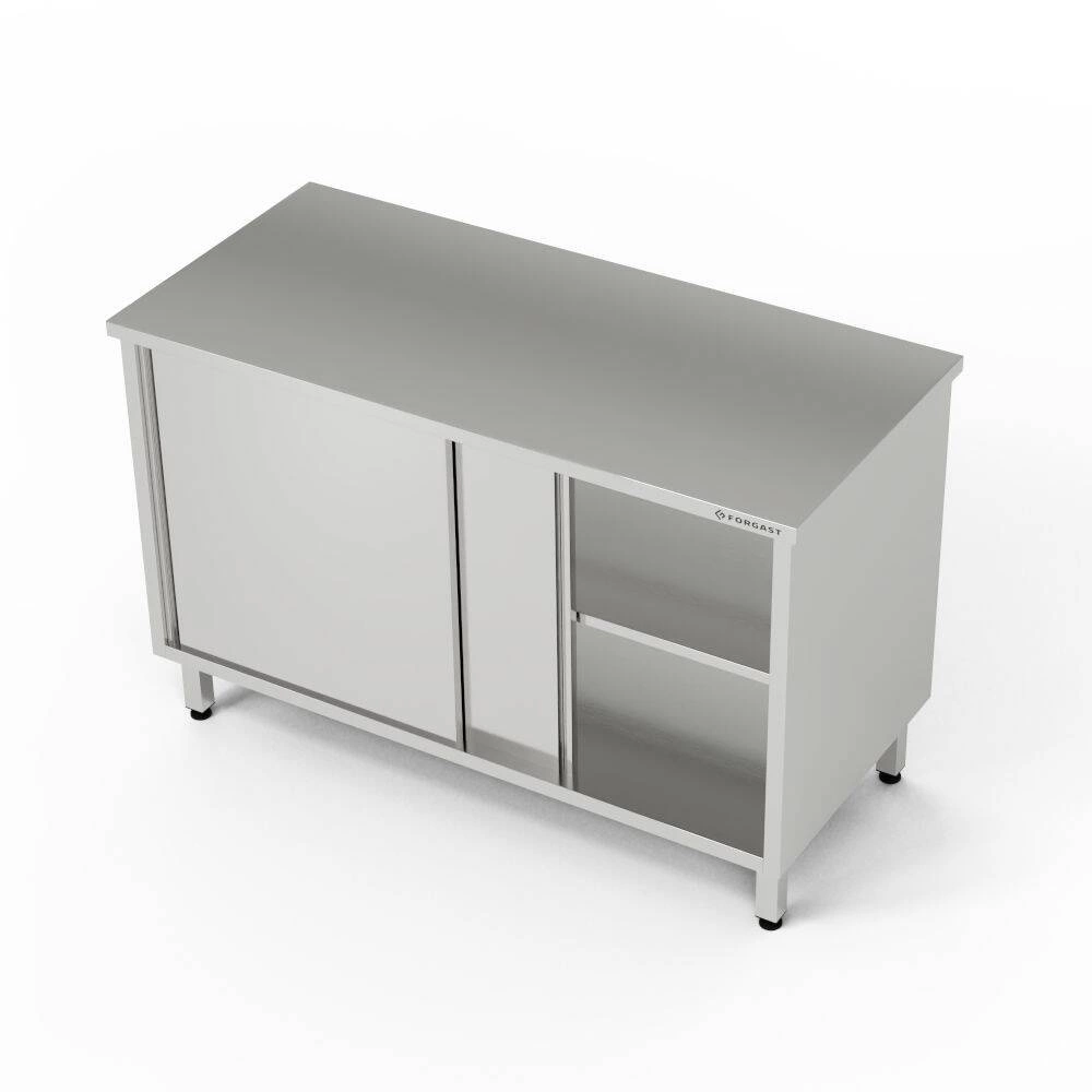Pracovní stůl o rozměrech 90x60x85 cm se skříňkou s posuvnými dveřmi z nerezové oceli J4. Uvnitř skříňky je pó³ka. Skříňka má posuvné dveře na obou stranách.