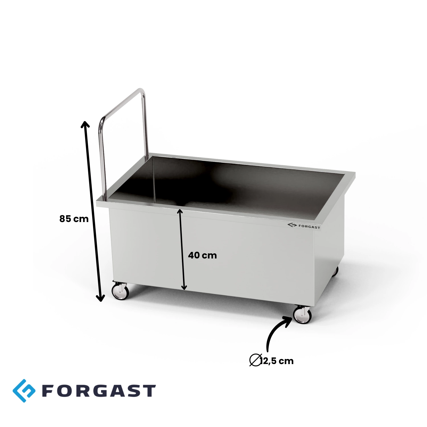 Nerezový pojízdný jednokomorový dřez nízký (hl. 40 cm) 110x60x85 cm FORGAST je specializovaný dřez určený pro profesionální kuchyně a potravinářské provozy. Vyniká mobilitou díky konstrukci na kolečkách a hlubokou komorou z nerezové oceli, která umožňuje pohodlné mytí velkých hrnců, nádob či van. Produkt byl navržen s ohledem na místa s vysokými nároky na hygienu a flexibilní správu pracovního prostoru.