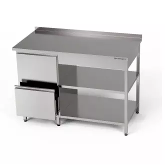Nerezový pracovní stůl s blokem zásuvek a dvěma policemi 220x70x85 cm