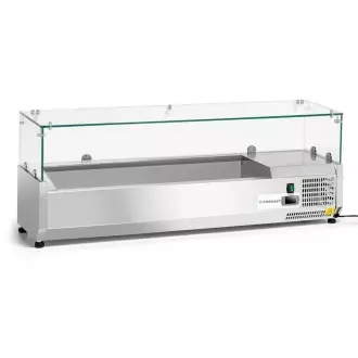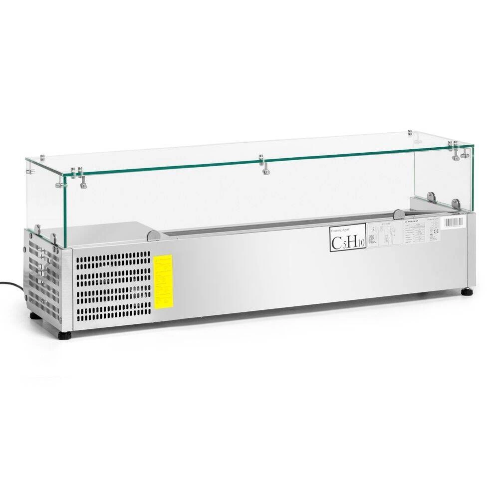 Tento chladicí nástavec je vyroben z nerezové oceli, což zaručuje odolnost, odolnost vůči korozi a snadnou údržbu – klíčové aspekty v profesionálních kuchyních. Prosklená horní část s rovnou skleněnou vitrínou umožňuje prezentaci ingrediencí bez rizika jejich kontaminace. Chladicí komora pojme nádoby GN 1/4 o hloubce až 15,5 cm, což činí zařízení velmi univerzálním. Díky chladicí jednotce Embraco zajišťuje nástavec stabilní skladovací podmínky i při intenzivním provozu, například v pizzeriích, salátových barech nebo snídaňových bufetech.