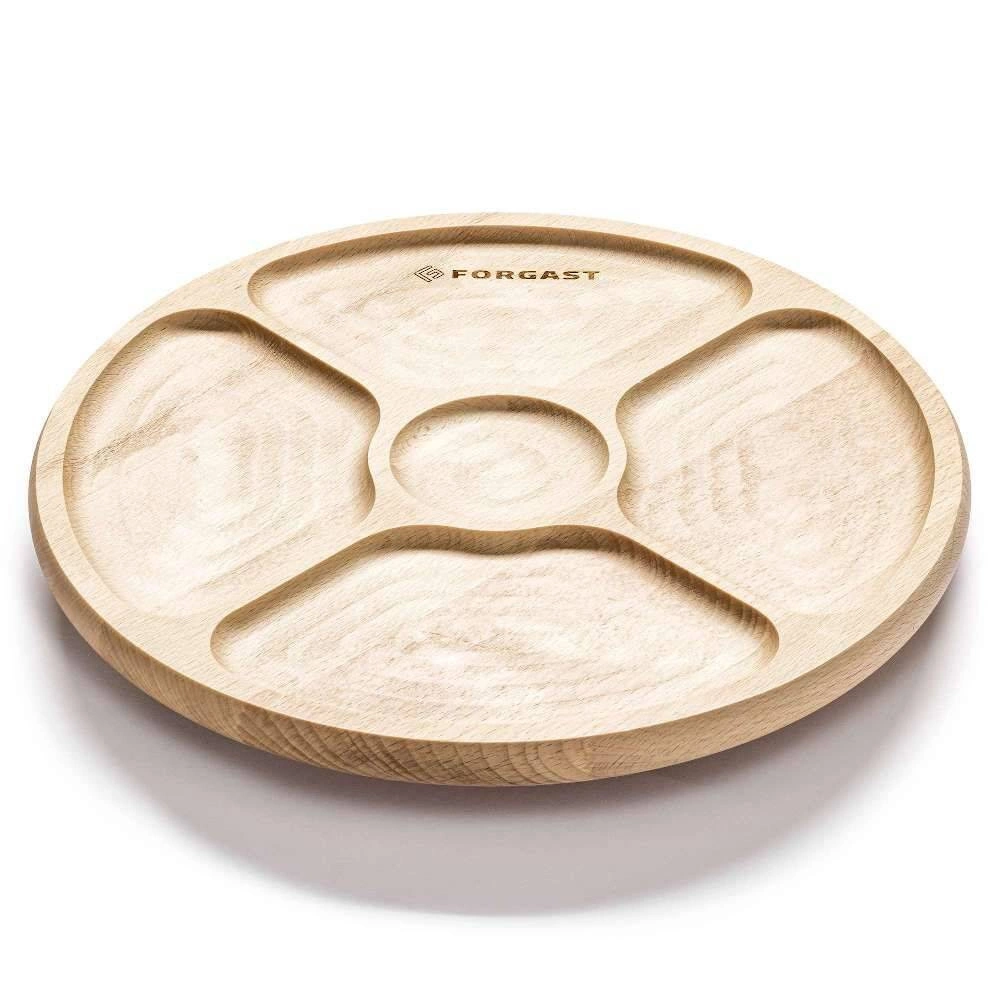 Otočná dřevěná servírovací deska se 4 přihrádkami FORGAST FG12650 je praktickým a elegantním doplňkem každé kuchyně, restaurace nebo baru. Vyniká přírodním bukovým povrchem a funkčním rozdělením na čtyři přihrádky a centrální prostor na omáčky. Ideální pro servírování sýrů, uzenin, pochutin nebo jiných pokrmů, uplatní se jak při domácích setkáních, tak v profesionální gastronomii.