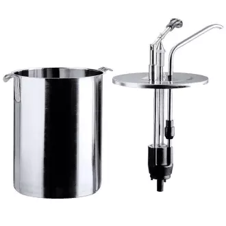Dávkovač s čerpadlem o objemu 6 litrů. Vyrobeno z nerezové oceli 18/10. Pumpa s nastavitelnou velikostí porce. Rukojeti pro snadné přenášení. Lze připevnit na pracovní desku. Odolná vůči teplotám do 70 stupňů Celsia.