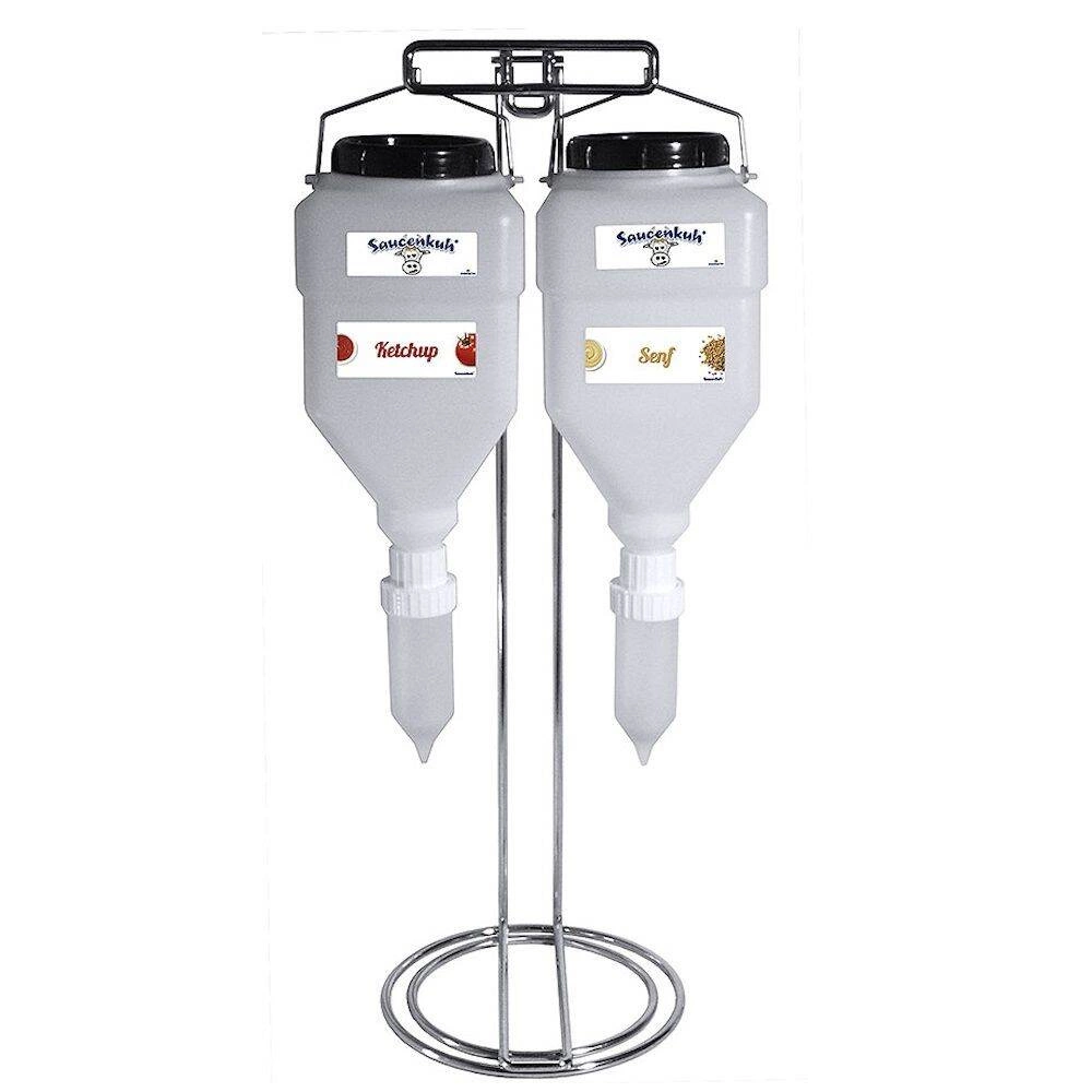 Dávkovač omáček s dvojitými sklenicemi o objemu 5,5 litru s kovovým stojanem. . Umožňuje pohodlné dávkování omáček . Součástí balení jsou dvě nádoby na omáčky ze silikonu a kovový stojan.