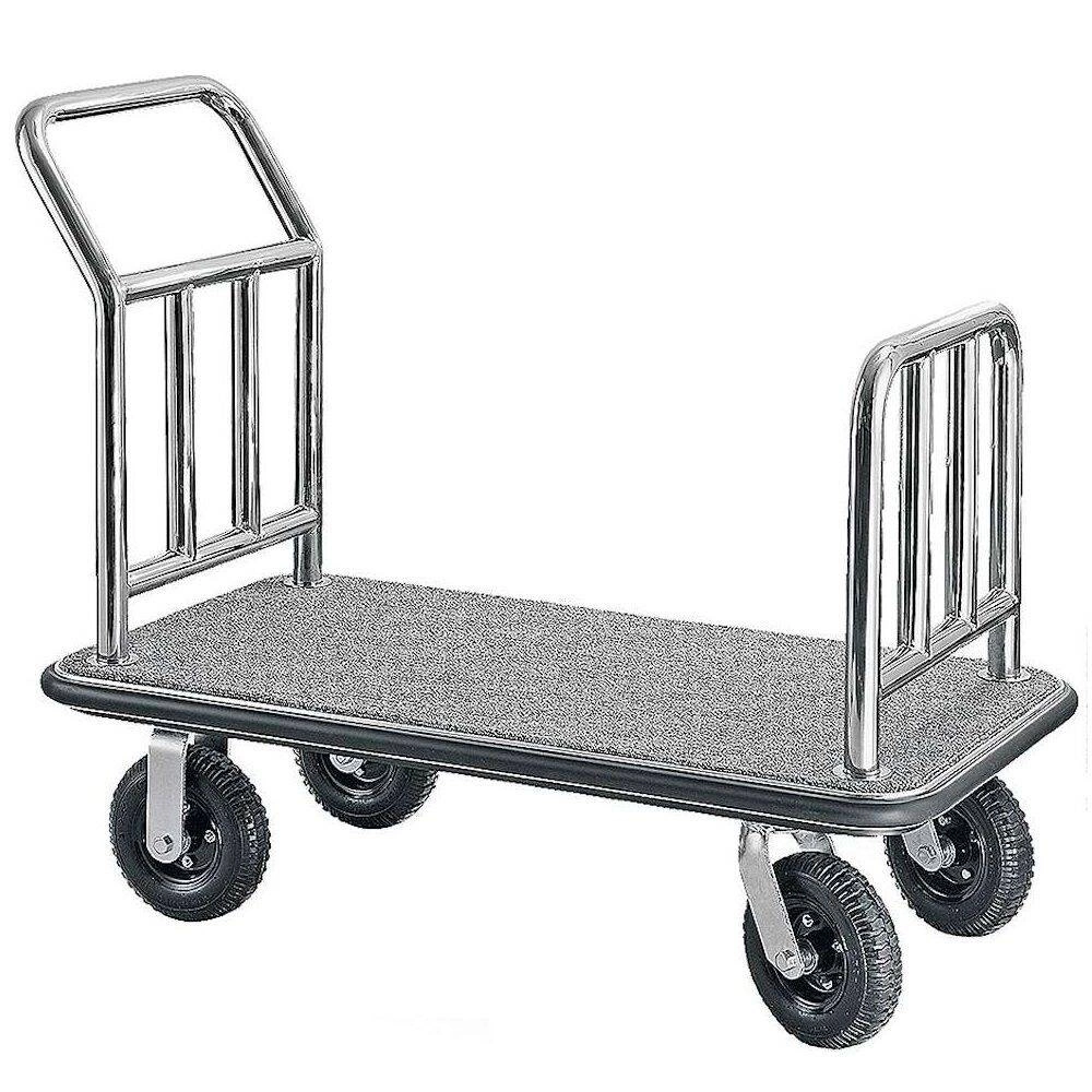Vozík na zavazadla z nerezové oceli. 4 kólopatky, průměr 20 cm. Gumové nárazníky. Přepravní plocha potažená šedou tkaninou.