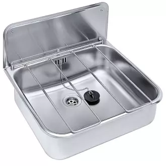 Umyvadlo z nerezové oceli. Montáž na stěnu s bezpečnostním přepadem, držákem, řetízkovou zátkou a ventilem.