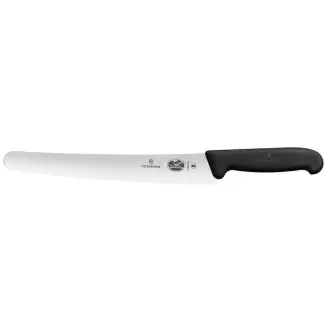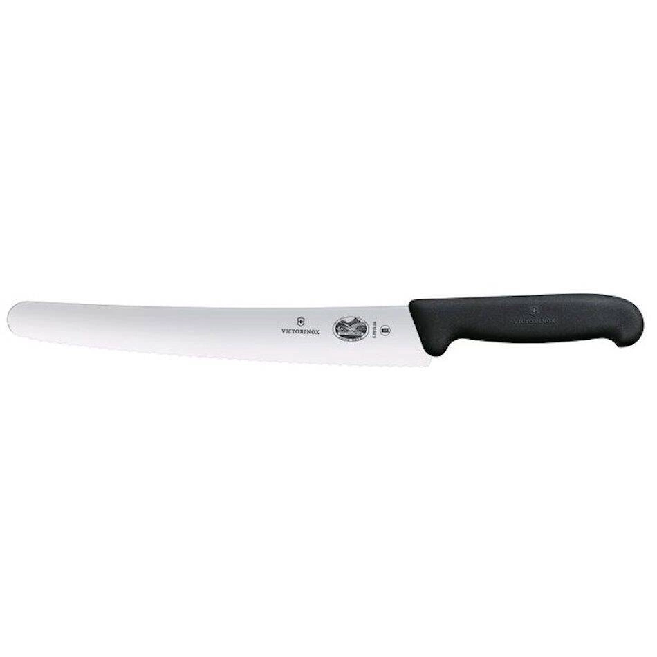 Nó¿ cukrovinky mark Victorinox. Ideální pro krájení koláčů a chleba. . Čepel nože má vroubkované ostří a je vyrobena z válcované nerezové oceli. Vysoká kvalita nerezové oceli zajišťuje, že si čepel zachovává svou ostrost po dlouhou dobu. Délka čepele je 26 cm. Protiskluzová rukojeť FIBROX v černé barvě zaručuje bezpečnou práci. Díky ergonomickému tvaru se dobře drží v ruce. Nůž lze sterilizovat při maximální teplotě 110 °C. Nóy lze mýt v myčce nádobí.