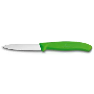 Kráječ na zeleninu se zelenou rukojetí od společnosti Victorinox. Ideální pro loupání zeleniny a ovoceów. 8 cm dlouhá čepel je vyrobena z válcované nerezové oceli se zvýšenou pevností, takže si dlouho zachovává ostrost. Rukojeť nože je vyrobena z polypropylenu v zelené barvě. Díky ergonomickému tvaru rukojeti nůž dobře sedí v ruce, což zvyšuje pohodlí. Lze jej mýt v myčce nádobí.