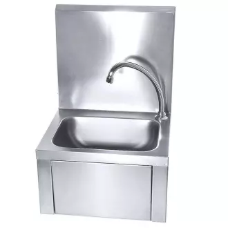 Umyvadlo z nerezové oceli. Aktivace proudu vody stisknutím přední stěny kolenem. Pro montáž na stěnu.