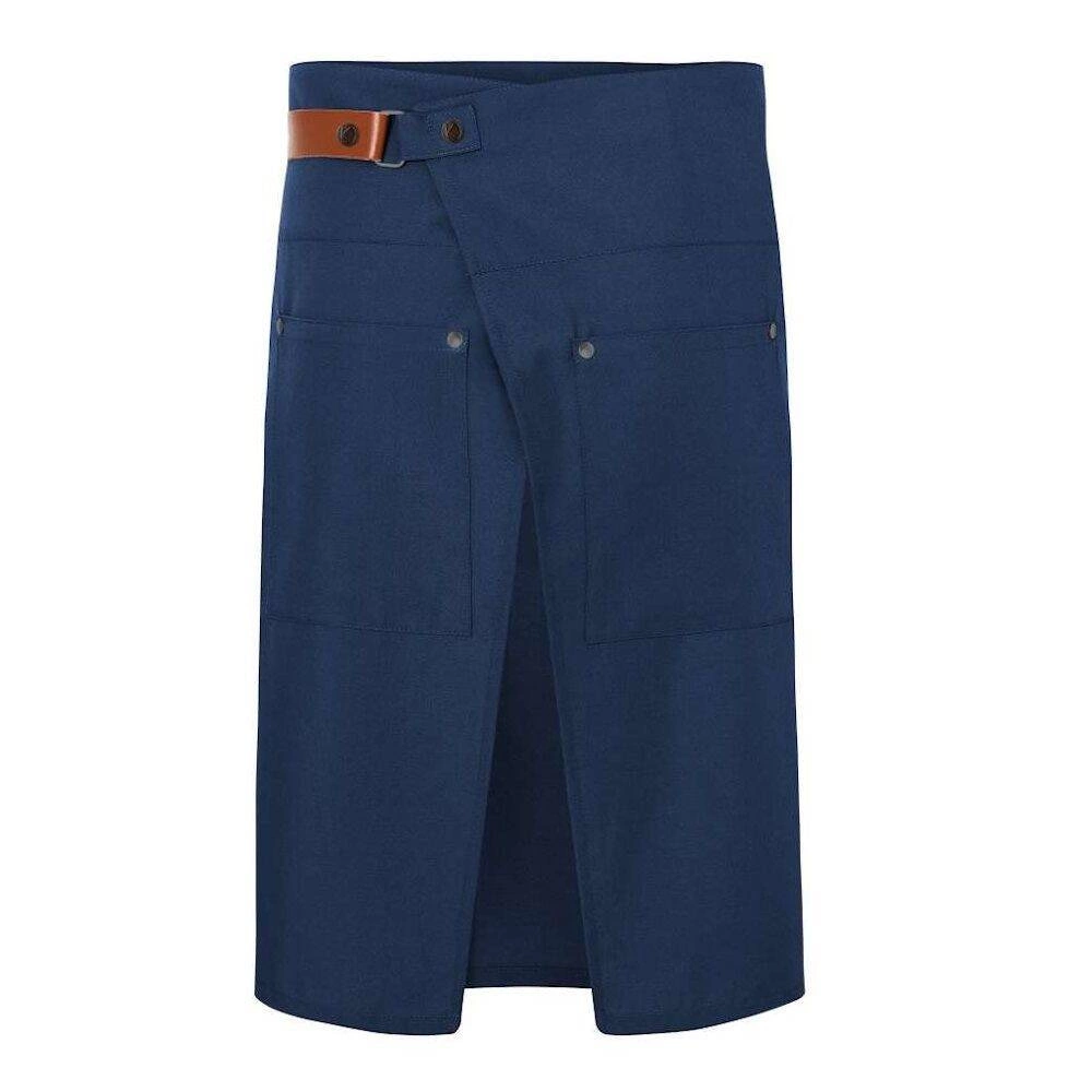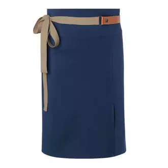 Vyrobeno ze směsi 35 % bavlny a 65 % 100% recyklovaného polyesteru. Moderní keprová vazba. Odolná a snadno čistitelná stylová modrá barva. Dvě našité kapsy o rozměrech 18x20 cm. Popruh z pravé kůžeóry v kontrastních barvách. Připevňuje se pomocí patentek. Vycházkový rozparek pro volnost pohybuów.