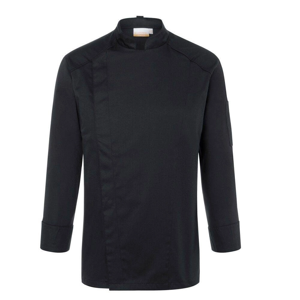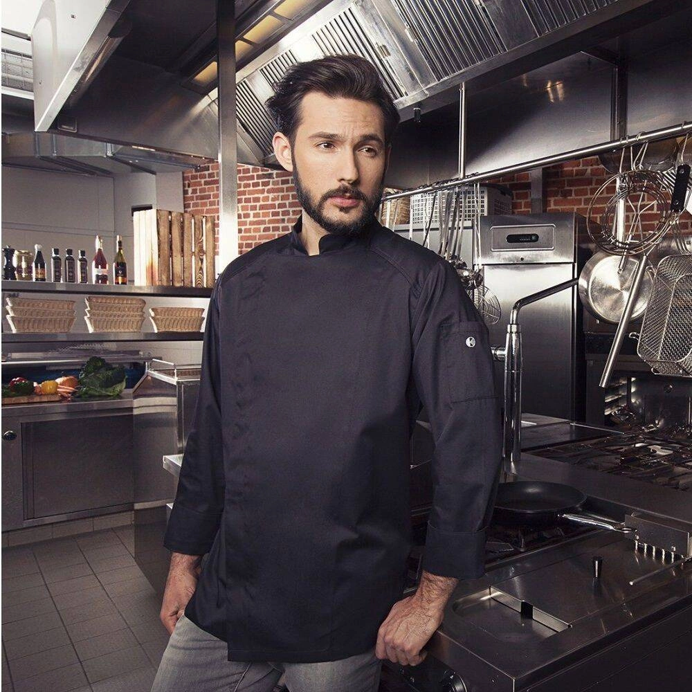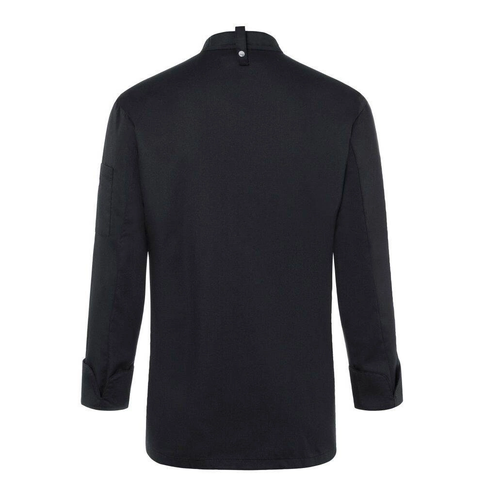 Pánská mikina Noah pro kuchaře od společnosti Karlowsky. Černá barva. Vyrobeno v 50 % polyester a 50 % bavlna. . Diagonální vazba. Elegantní pánská mikina pro kuchaře se skrytým zapínáním na knoflíky. Vyrobena z velmi lehkého materiálu, který se dokonale hodí do teplých podmínek. Optimální pohodlí při nošení zajišťuje vypasovaný střih. Na zadní straně límce je praktický pásek na zástěru, který zabraňuje sklouznutí. Manžety s rozparkem. Na levém rukávu je našita kapsa s přihrádkou na pero. Vhodné pro průmyslové praní a chemické čištění. Lze bělit. Dostupné velikosti od 46 do 64.