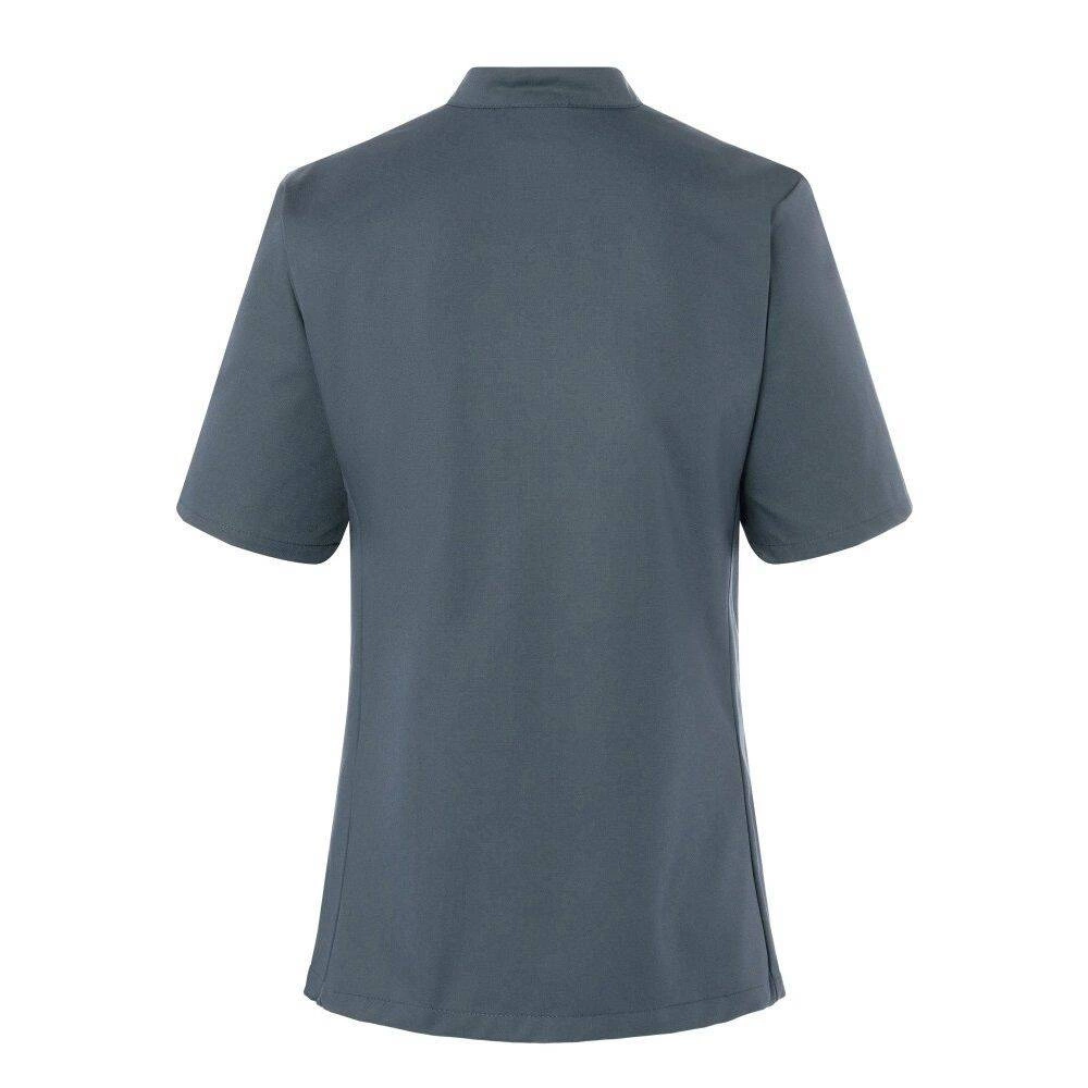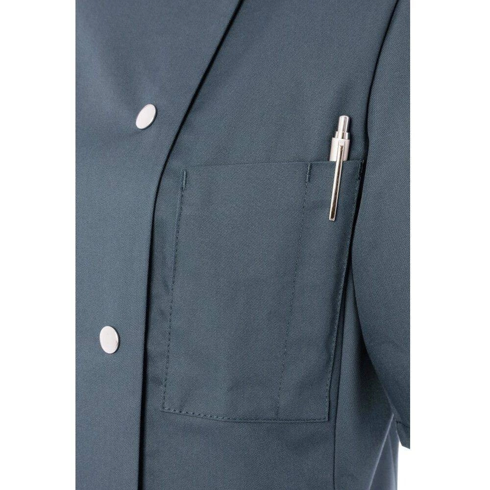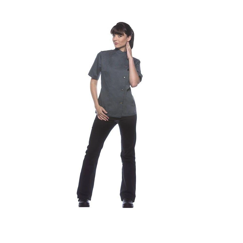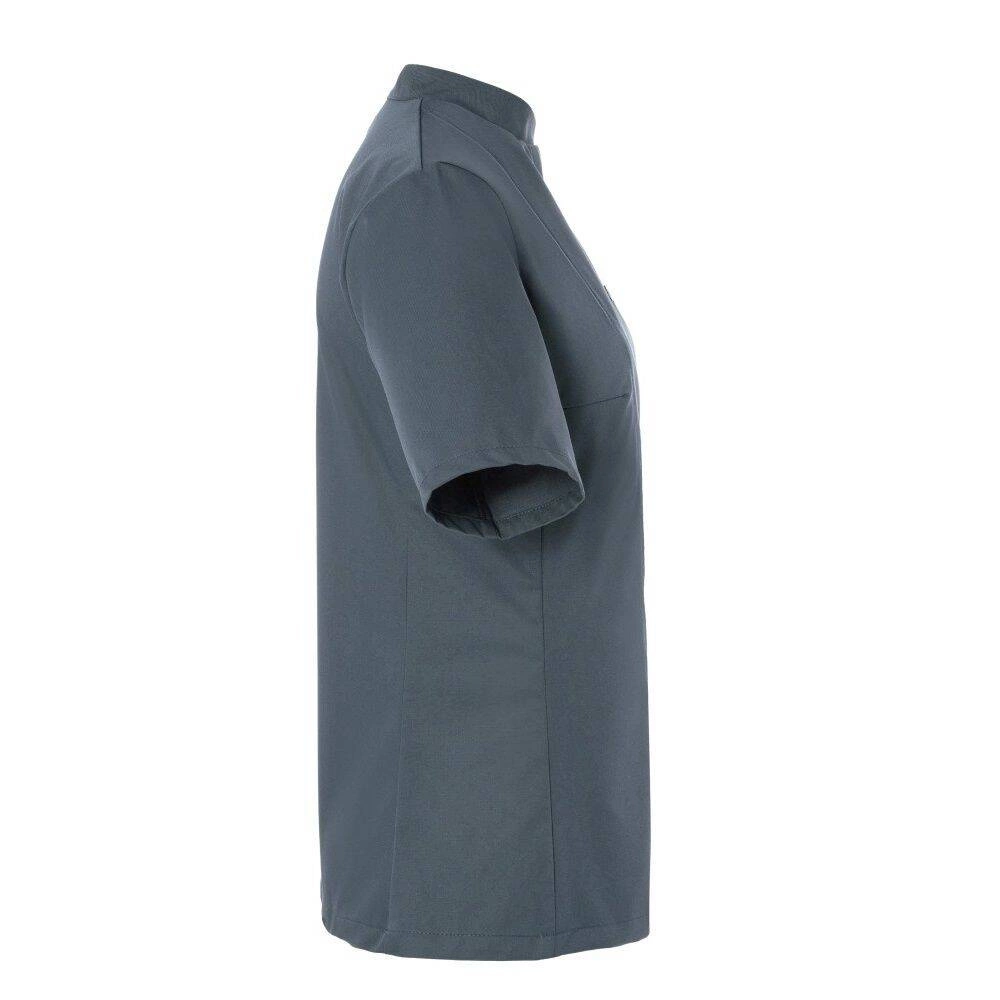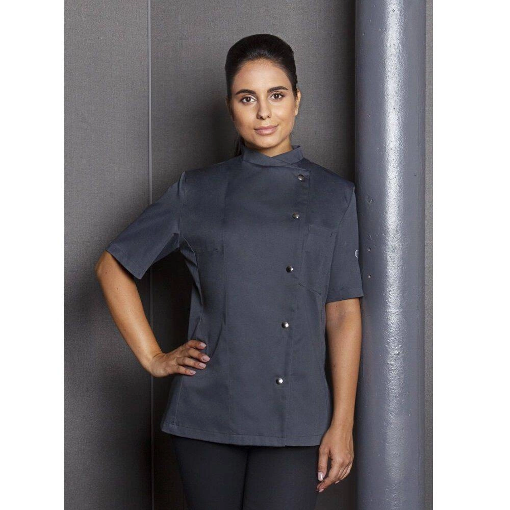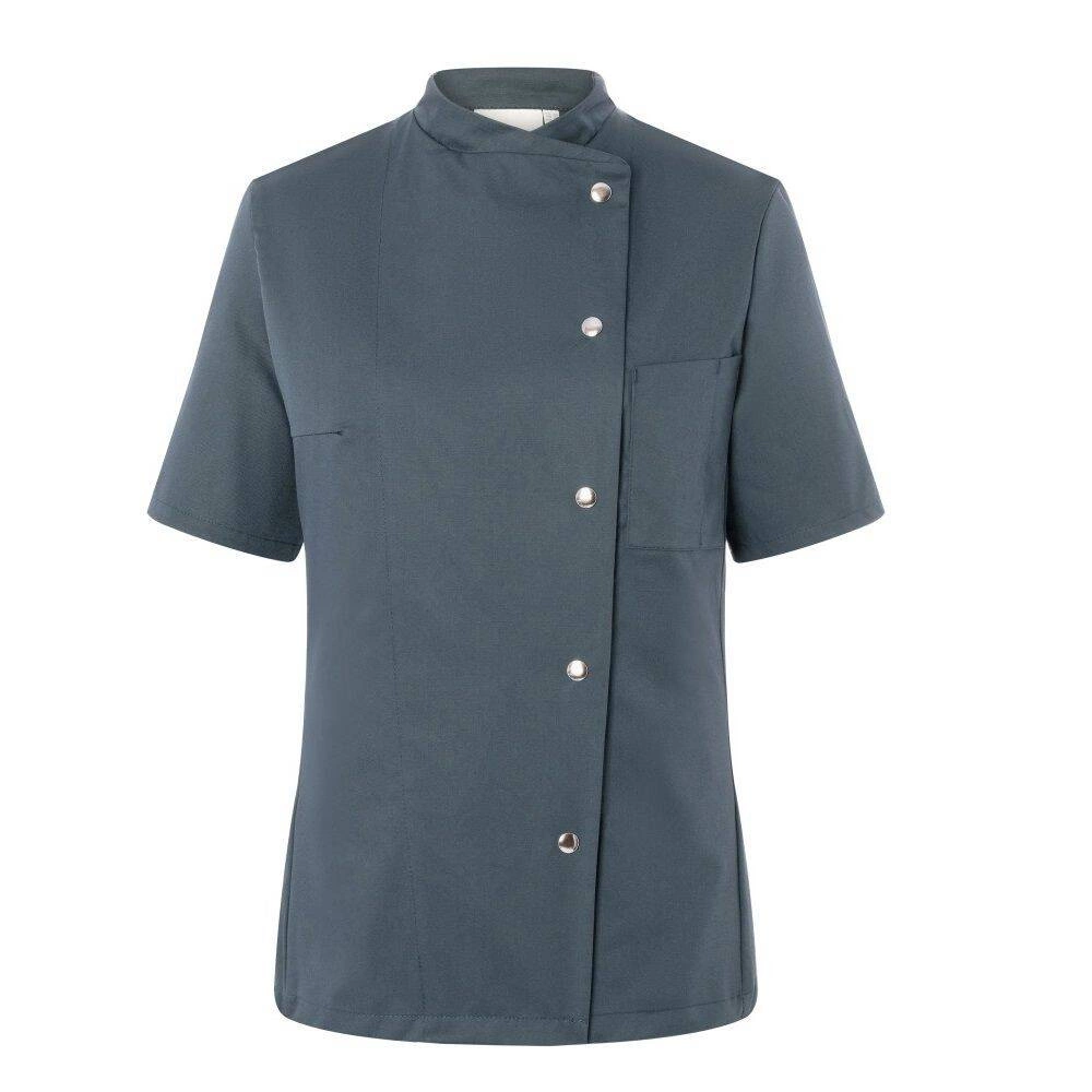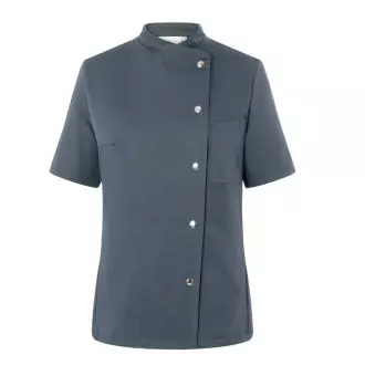 Dámská mikina Greta Chef od značky Karlowsky. Antracitová barva. Vyrobeno z 65 % polyesteru a 35 % bavlny. . Keprová vazba. Přiléhavá kuchařská mikina s krátkými rukávy. Přiléhavý střih zajišťují záševky na prsou a boční švy na přední a zadní straně mikiny. Na levé straně na hrudi je kapsa. Mikina se zapíná na 5 knoflíkóů a patentky. Lze ji prát průmyslově. Nebělit. Dostupné velikosti od 34 do 50.