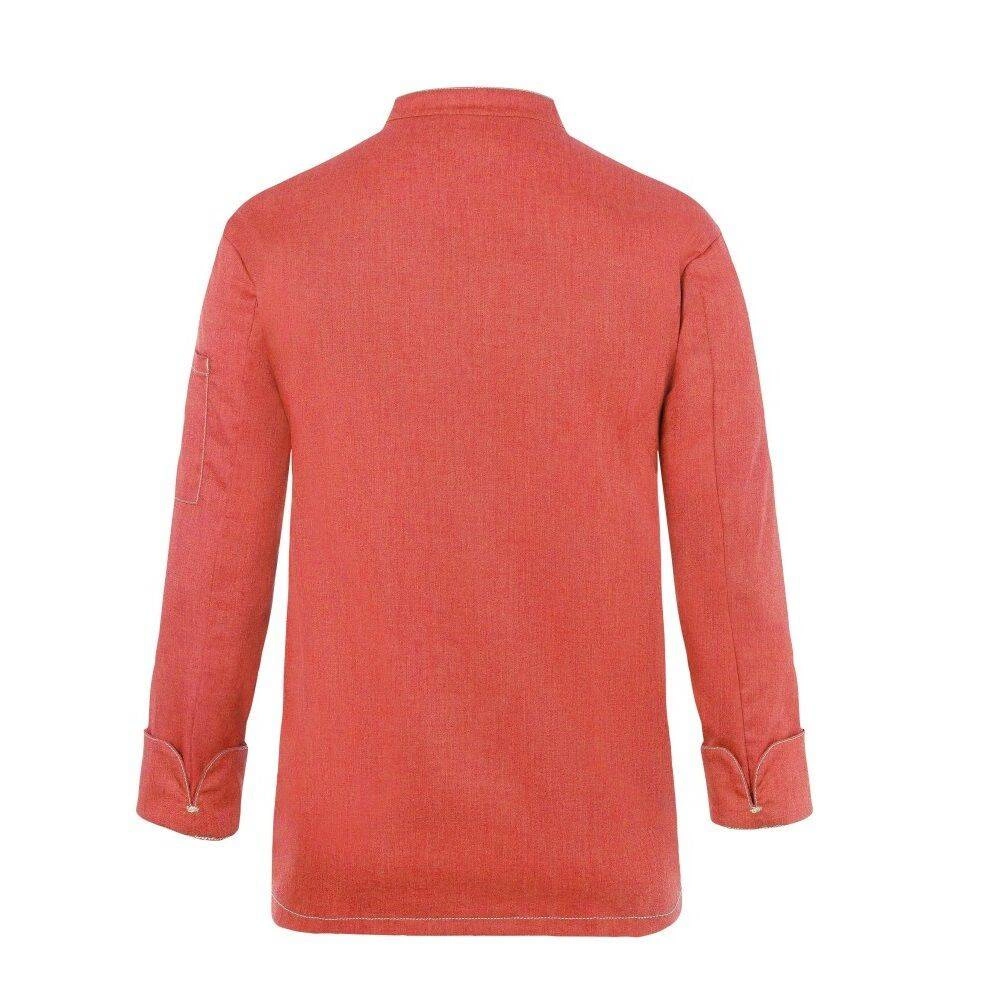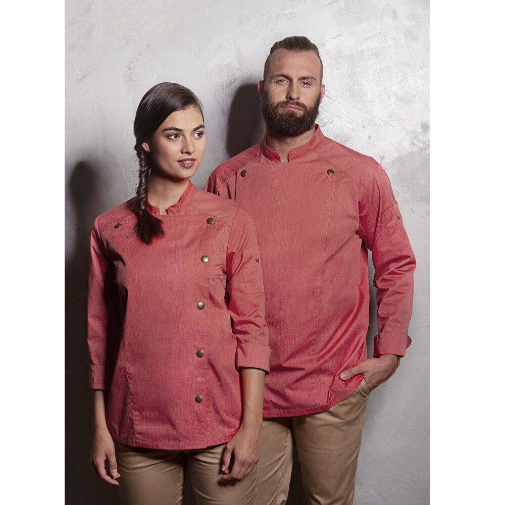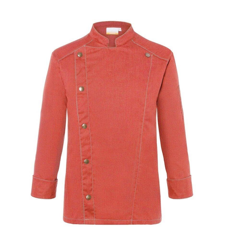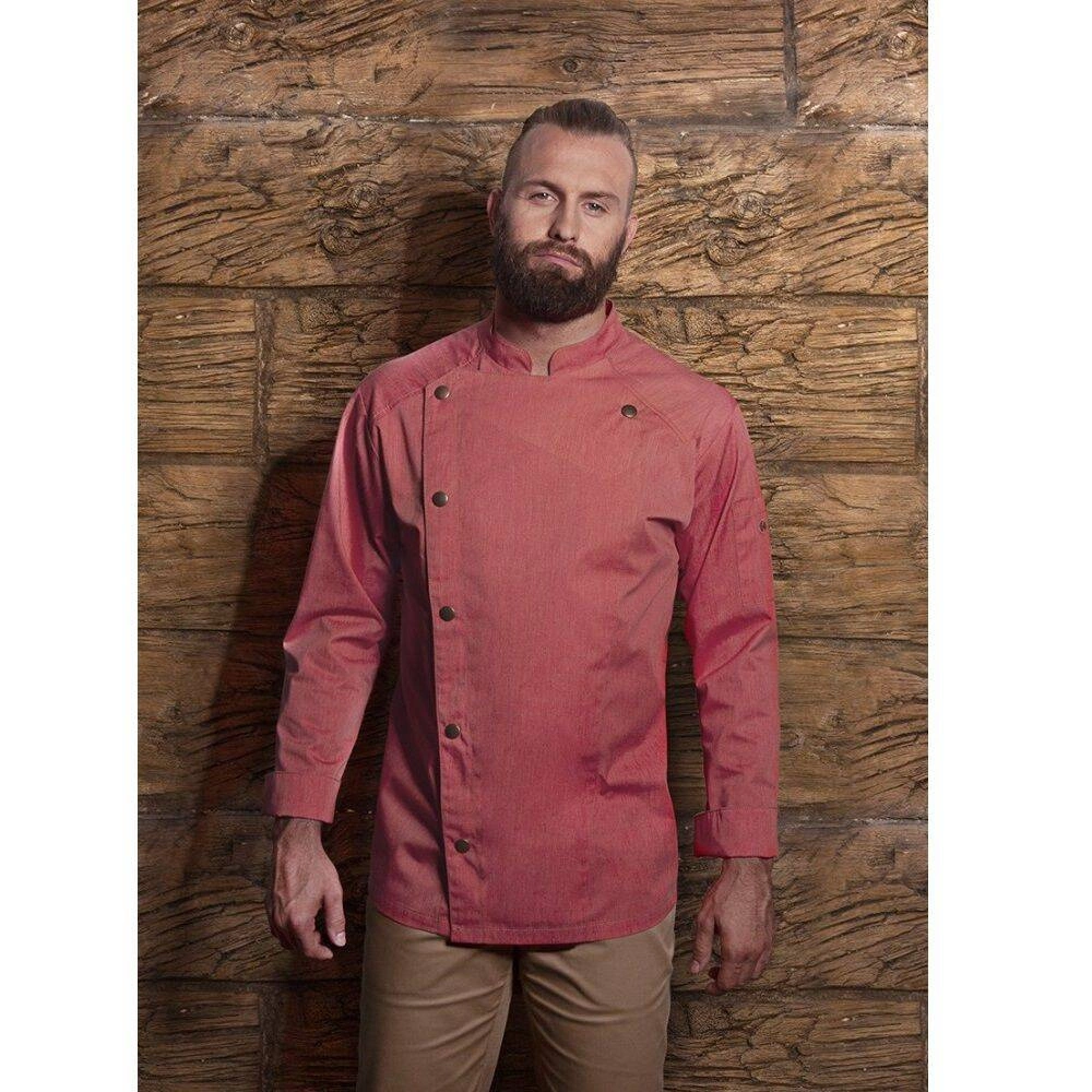 Pánská mikina pro kuchaře ve stylu džínoviny od značky Karlowsky. Barva vintage-červená. vyrobeno v 65 % polyester a 35 % bavlna. . Diagonální vazba. Módní mikina pro kuchaře v džínovém stylu s kontrastním prošíváním, rozříznutými manžetami a kapsou na levém rukávu. Asymetricky zapínaná jednořadová mikina s 5 knoflíky a patentkami. Vhodné pro průmyslové praní a chemické čištění. Nebělit. Dostupné velikosti od 46 do 74.