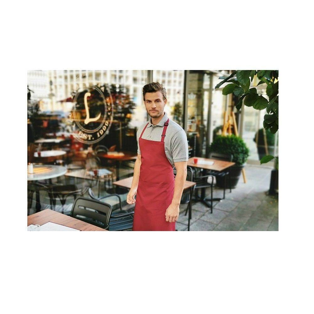 Základní kuchařská zástěra značky Karlowsky. Malinová barva. Vyrobeno v 65 % polyester / 35 % bavlna. . Diagonální vazba. Rozměry 75x90 cm. Zástěra s popruhy z materiálu zástěry se zesílenými napínacími body - popruh za krk se sponou pro nastavení délky cca 70 cm - náplasťová kapsa se 2 přihrádkami (40 x 20 cm). Lze prát v pračce a čistit chemicky. Vhodné k žehlení.