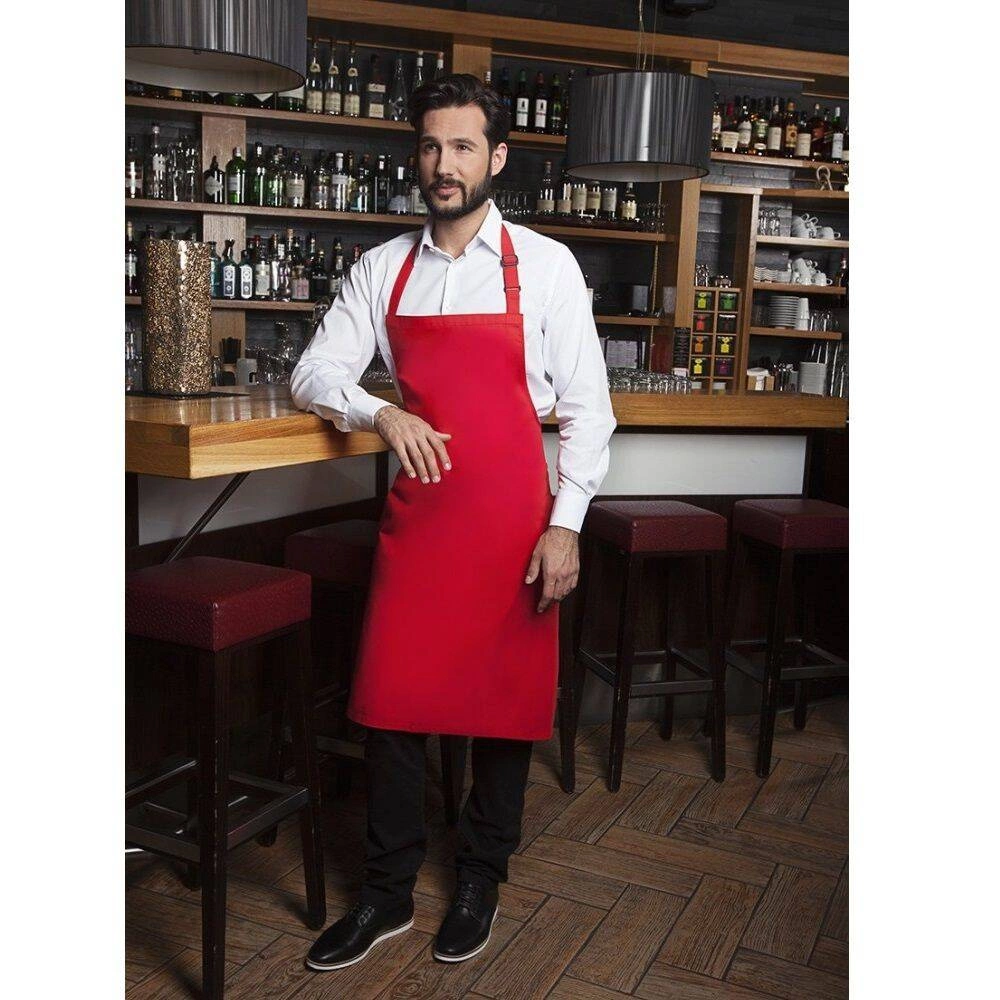 Základní kuchařská zástěra značky Karlowsky. Červená barva. Vyrobeno v 65 % polyester / 35 % bavlna. . Diagonální vazba. Rozměry 75x90 cm. Zástěra s popruhy z materiálu zástěry se zesílenými napínacími body - popruh na krk se sponou pro nastavení délky cca 70 cm. Lze prát v pračce a čistit chemicky. Vhodné k žehlení.