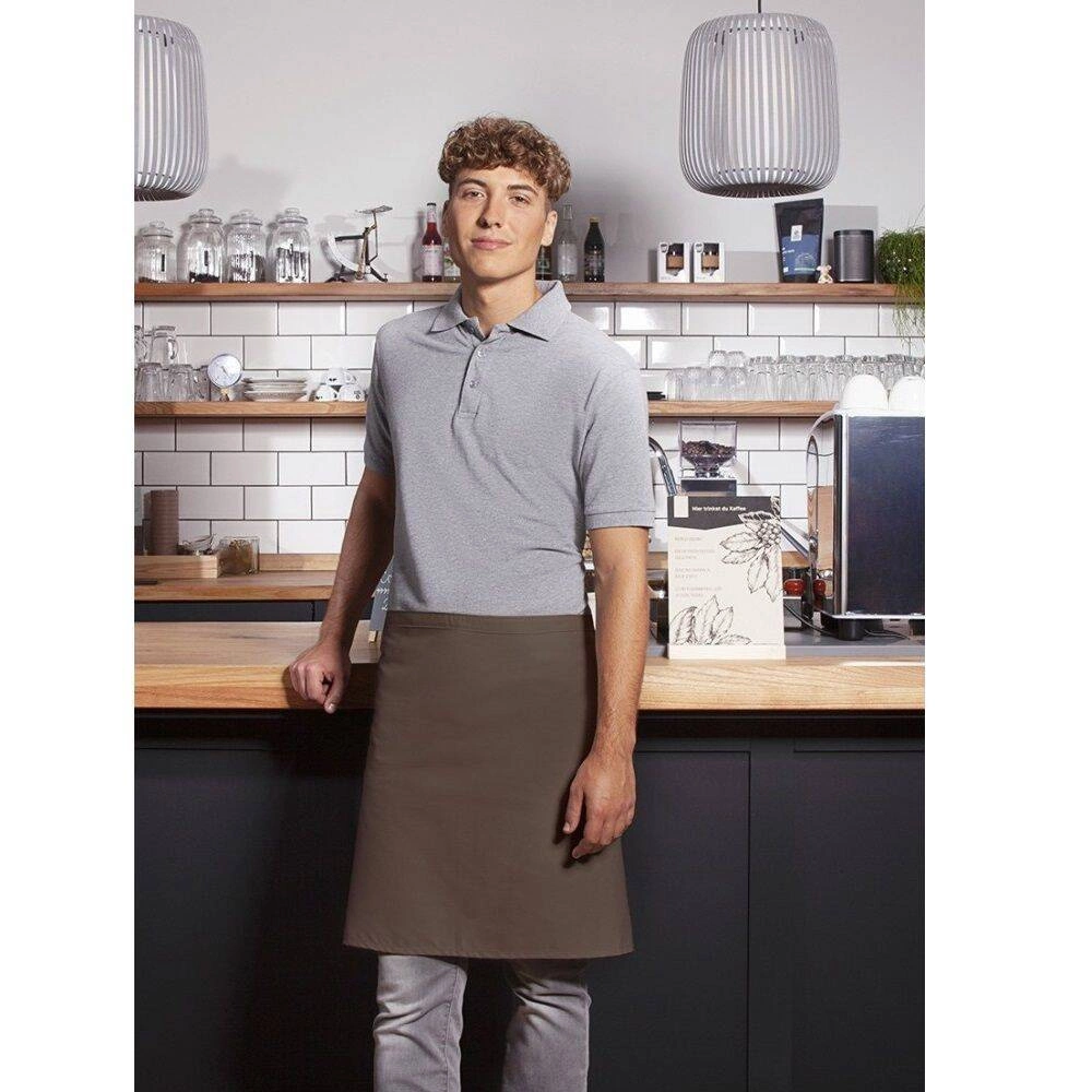 Zástěra Basic značky  Karlowsky. Barva světle hnědá. Vyrobeno z 65 % polyesteru a 35 % bavlny. Keprová vazba. Rozměry 70 x 55 cm. Zavinovačka s bederním pásem ze stejného materiálu. Pásek vyztužený dalšími napínacími body.  Lze prát na 60 °C. . Nebělit. Nesušte v sušičce. Žehlete při maximální teplotě 150 °C °C.