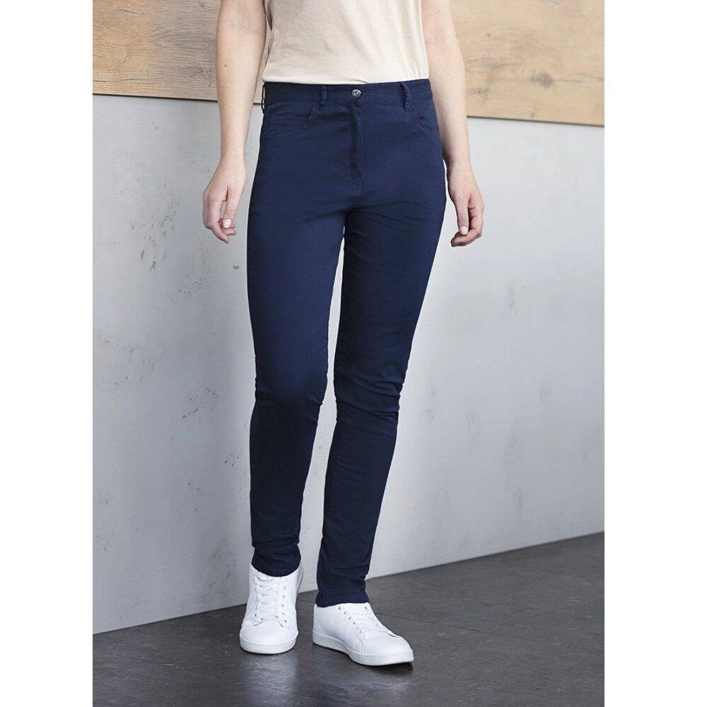 Dámské kalhoty s 5 kapsami značky Karlowsky. Modrá barva. Vyrobeno z 98 % organické bavlny a 2 % elastanu. Keprová vazba. Odolné a pružné. Kalhoty ideální do práce i na běžné procházky. Osvědčí se v oblastech, jako je kuchyně, služby, ošetřovatelství, wellness, kosmetika, úklid a medicína. Přiléhavý pas, zúžené nohavice. Na přední straně jsou 2 standardní kapsy a jedna menší kapsa na mince na pravé straně. Vzadu 2 kapsy. Kalhoty s poutky na opasek.