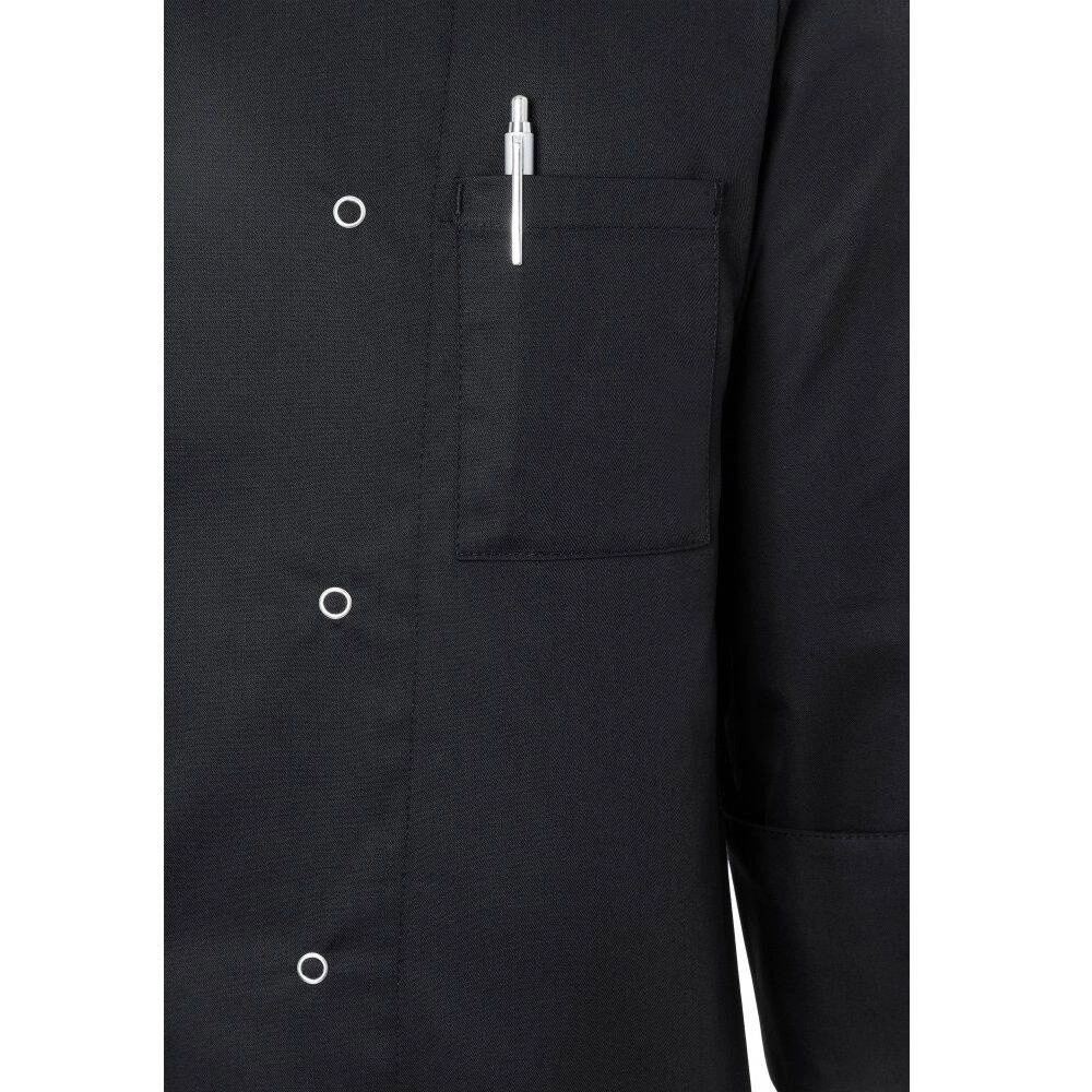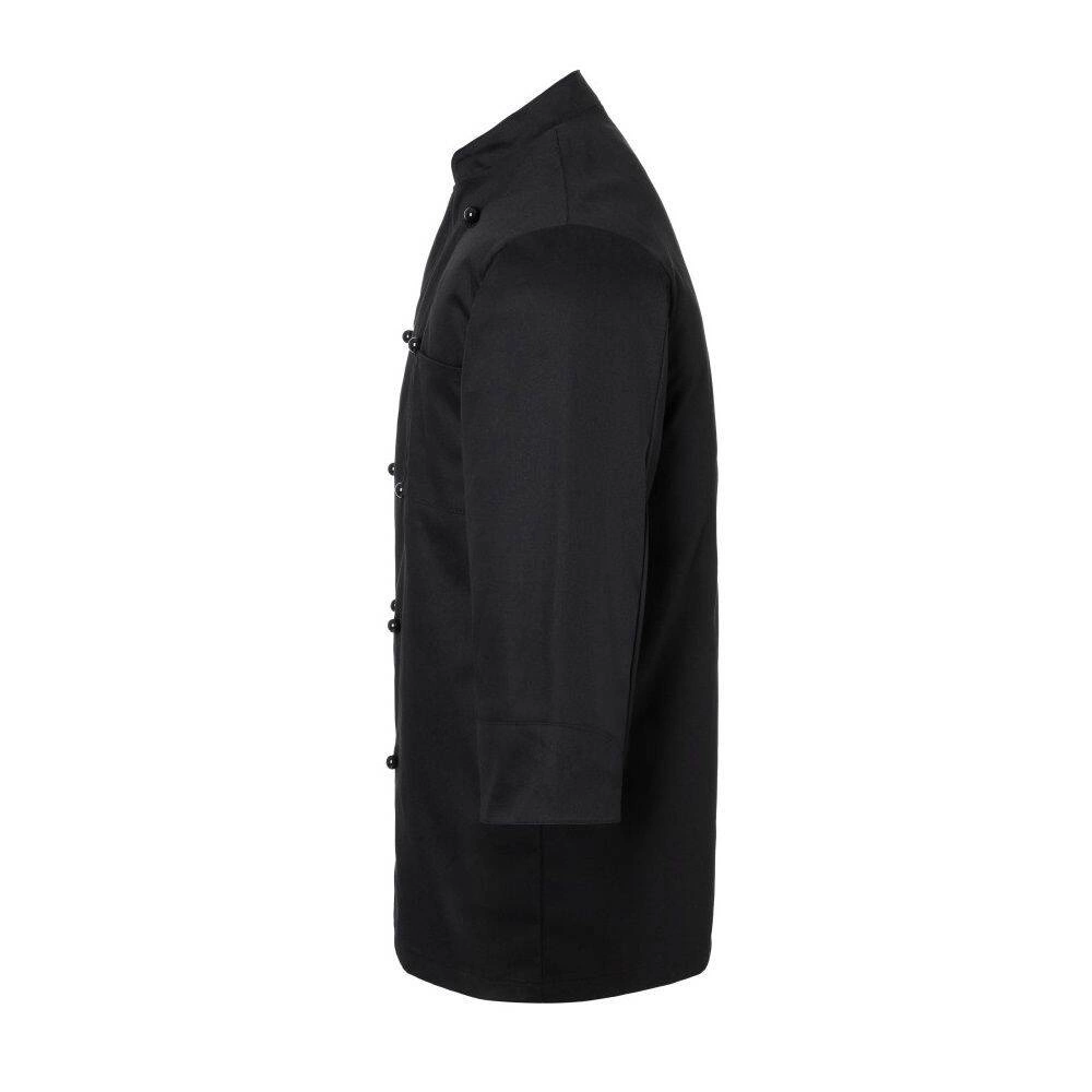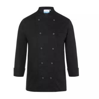 Základní pánská mikina pro kuchaře od společnosti Karlowsky. Černá barva. Vyrobeno z 35 % bavlny a 65 % polyesteru. Keprová vazba. Mikina má pravidelný spodní lem a manžety s rozparkem. Kapsa na hrudi na levé straně. Dvouřadá mikina s 10 černými knoflíky a 10 patentkami. Lze prát v pračce a žehlit. Nesušit v sušičce ani nebělit. Dostupné velikosti od XS do 3XL
