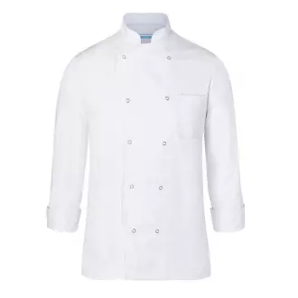 Základní pánská mikina pro kuchaře od společnosti Karlowsky. Bílá barva. Vyrobeno z 35 % bavlny a 65 % polyesteru. Keprová vazba. Mikina má pravidelný spodní lem a manžety s rozparkem. Kapsa na hrudi na levé straně. Dvouřadá blůza s 10 bílými knoflíky a 10 patentkami. Lze prát v pračce a žehlit. Nesušit v sušičce ani nebělit. Dostupné velikosti od XS do 3XL