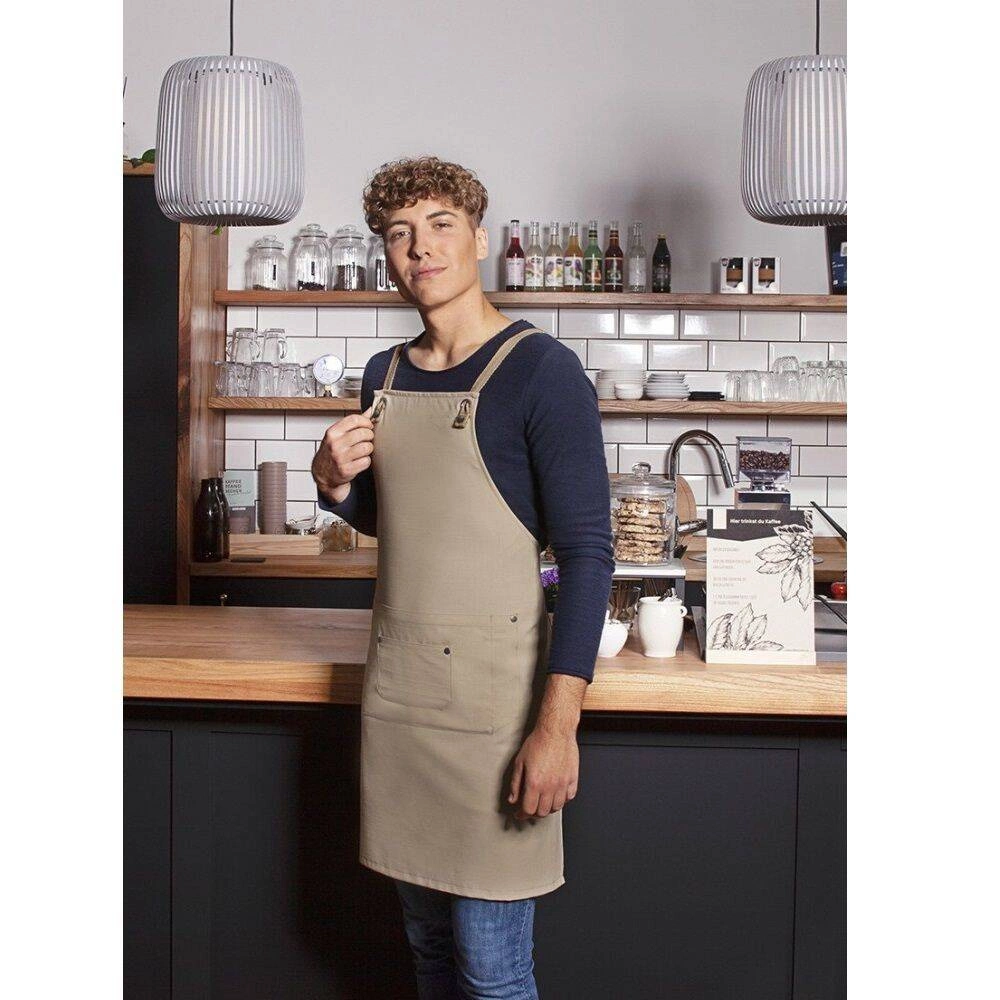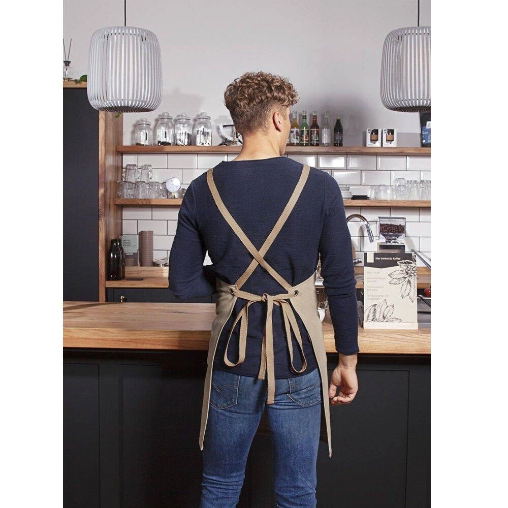 Zástěra Urban Nature X-Style s kapsou od Karlowsky.  Vyrobeno  z 65 % polyesteru a 35 % bavlny. Kamenně šedá barva. Velikost 70 x 85 cm. Zástěra na šle s odnímatelnými kontrastními barevnými stuhami. Všechny stuhy lze snadno a rychle odepnout pomocí patentek a jejich nasazení na ramena uleví krku. Délku a výšku nastavíte překřížením popruhů na zádech, jejich protáhnutím přezkami a následným zavázáním. Oba popruhy lze snadno odepnout a vyprat. Uprostřed všité kapsy: 1 velká přihrádka o rozměrech 39 x 20 cm, 2 boční přihrádky na tužky a 1 malá kapsa o rozměrech 17 x 11 cm. Lze prát při teplotě do 60 ° C. Nebělit. Žehlete při teplotě do 150 ° C.