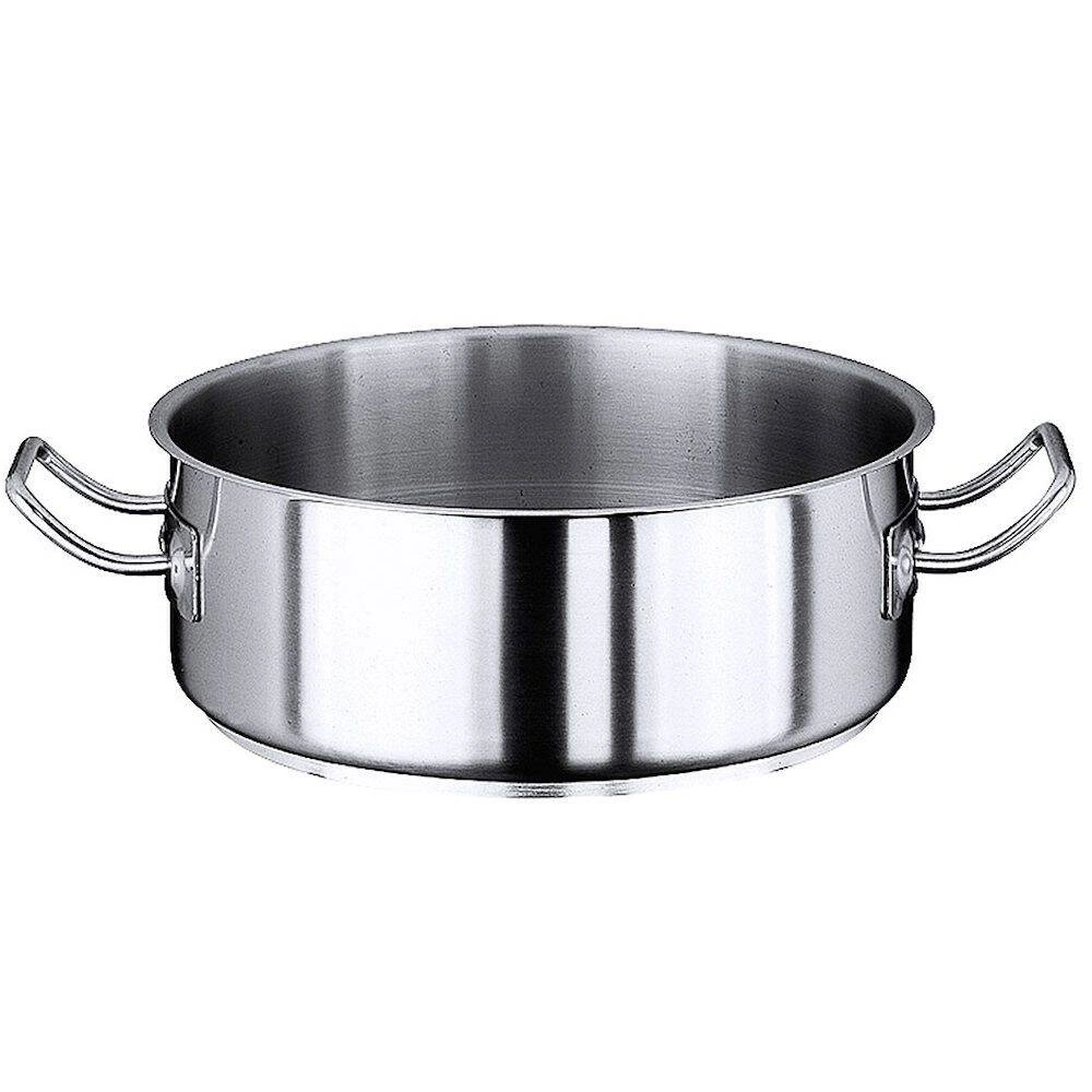 Nízký hrnec o objemu 38 litrů. Vyrobeno ze satinované nerezové oceli. Dno typu "sendvič". Zakřivený okraj.