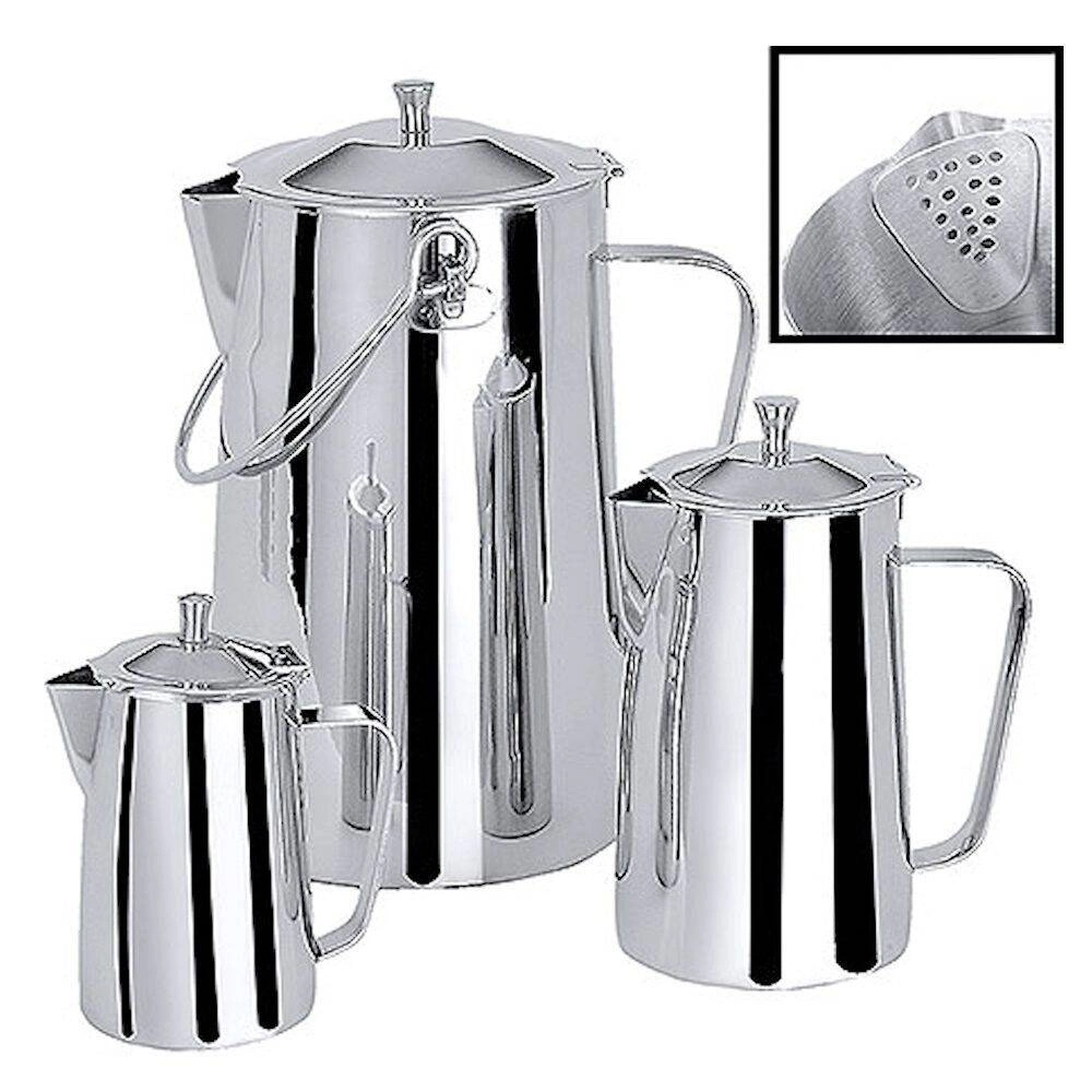 Čajová konvice o objemu 3 litryów. Vyrobeno z leštěné nerezové oceli. Džbán s víkem, rukojetí a integrovaným sítkem.