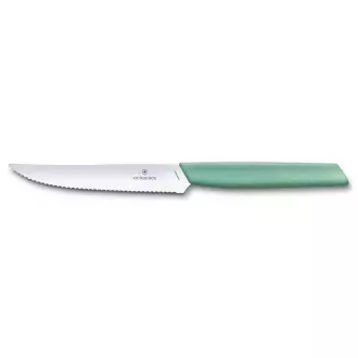 Steakový nůž značky Victorinox. Ideální pro použití v restauracích i v domácnosti. Určeno pro krájení steaků a žebírek. Jeho 12 cm dlouhá vroubkovaná čepel byla vyrobena ze zesílené nerezové oceli, která zajišťuje, že nóve zůstane dlouho ostrá. Moderní rukojeť je vyrobena z polypropylenu (PPC) v mátové/zelené barvě. Nůž má moderní a estetický design. Celková délka nože je 23,2 cm. Nůž je vhodný pro mytí v myčce nádobí.