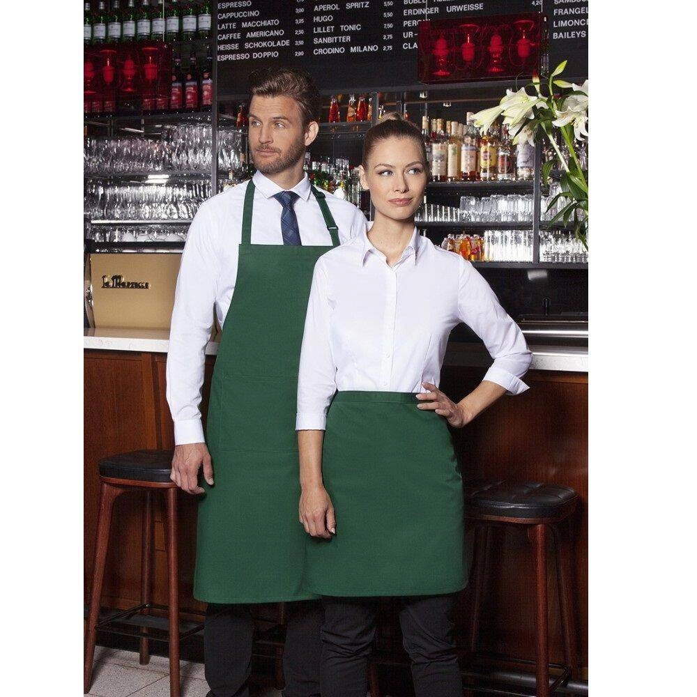 Zástěra Basic Karlowsky. Lesní zelená barva. Vyrobeno z 65 % polyesteru a 35 % bavlny. Keprová vazba. Rozměry 70 x 55 cm. Zástěra s bederním pásem ze stejného materiálu. Pásek vyztužený dalšími napínacími body. Lze prát na 60 °C. . Nebělit. Nesušte v sušičce. Žehlete při maximální teplotě 150 °C °C.