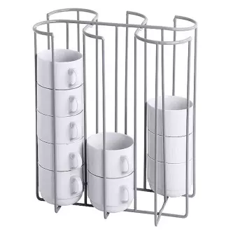 Stojan na šálky. Vyrobeno z ocelového drátu potaženého plastem. Určeno pro šálky s průměrem 8,7 cm.  6 přihrádek.