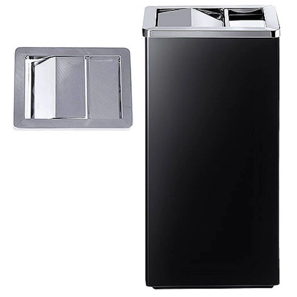 Stojící popelník z černě lakované oceli. Víko z nerezové oceli. Vložka o rozměrech 25x20x28 cm z pozinkované oceli.