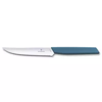 Steakový nůž značky Victorinox. Ideální pro použití v restauracích i v domácnosti. Určeno pro krájení steakůóa žebírek. Jeho 12 cm dlouhá vroubkovaná čepel byla vyrobena ze zesílené nerezové oceli, která zajišťuje, že nóve zůstane dlouho ostrá. Moderní rukojeť je vyrobena z polypropylenu (PPC) v chrpově modré barvě. Nůž má moderní a estetický design. Celková délka nože je 23,2 cm. Nůž je vhodný do myčky nádobí.