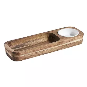 Dřevěná ponorná sada. . Podstavec je vyroben z akátového dřeva a měří 20x10x3,5 cm. Má plochu na svačinu o rozměrech 18x8 cm a porcelánovou misku o průměru 7 cm a výšce 2 cm.