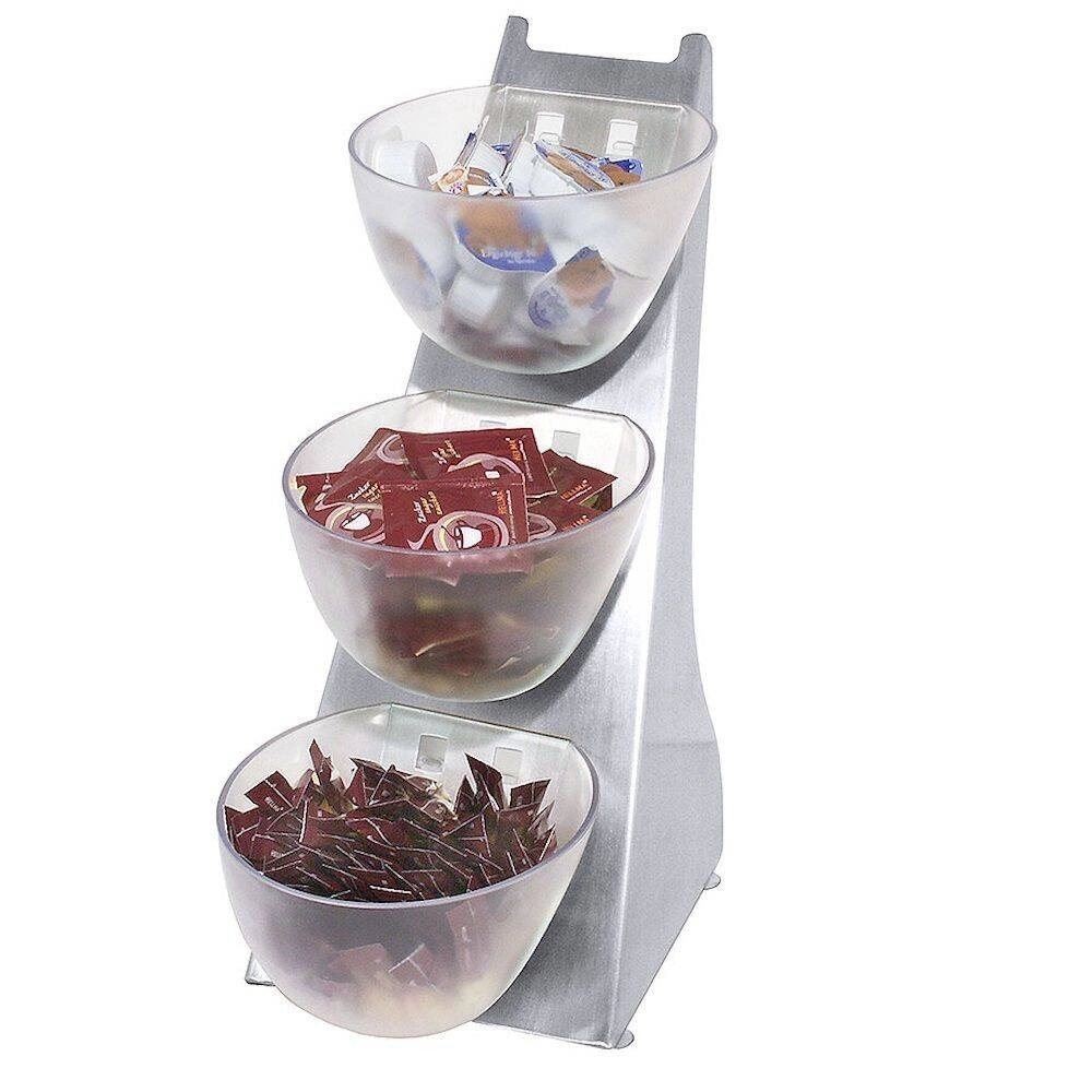 Bufetový stojan z nerezové oceli se 3 nádobami. Nádoby o objemu 1 litr z matného polystyrenu.