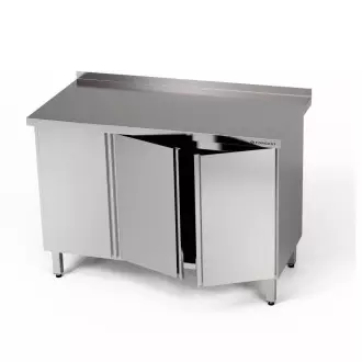 Třídveřový pracovní stůl se skříňkou;o rozměrech 120x70x85 cm z nerezové oceli J4. Otevírací dveře. Společná přihrádka, jedny dveře jsou na pravé straně. Ve skříni jsou półki.