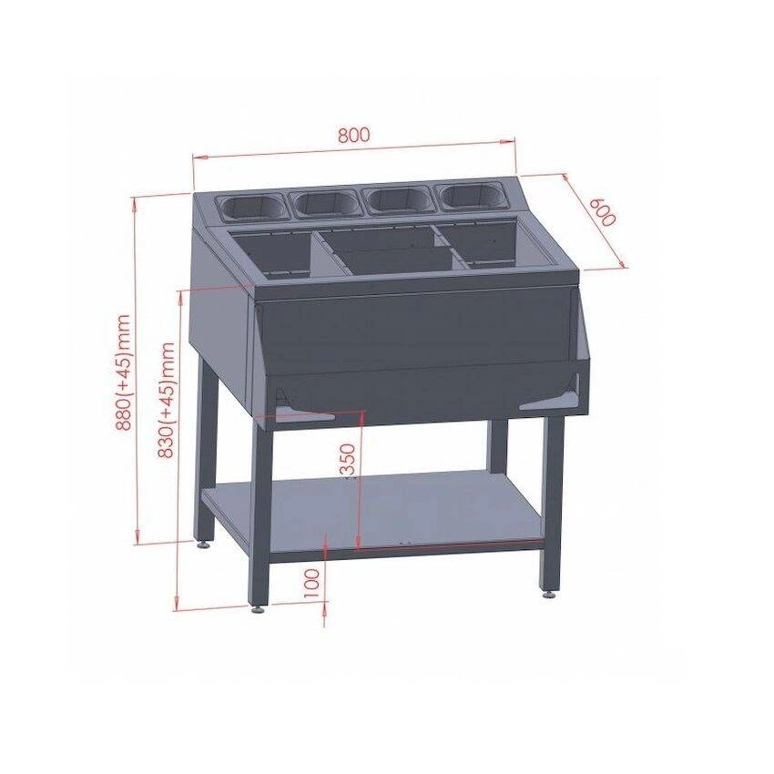 Koktejlová stanice 4x GN 1/9 FORGAST FG15415 je profesionální pracoviště určené pro přípravu koktejlů a drinků v barech, restauracích nebo hotelech. Zařízení se vyznačuje robustní konstrukcí z nerezové kyselinovzdorné oceli, která zajišťuje dlouhou životnost a snadnou údržbu. Díky použití čtyř GN 1/9 nádob a izolovaného ledu umožňuje stanice pohodlné skladování a rychlý přístup ke všem ingrediencím a ledu během práce barmana.