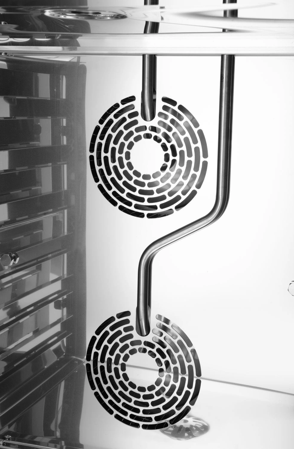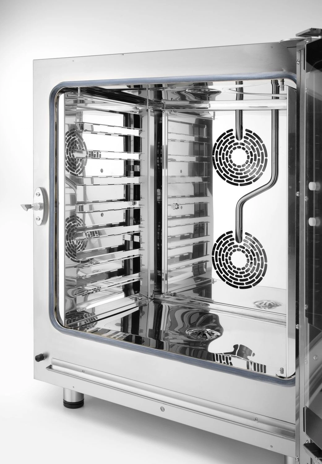Elektrická kombinovaná parní trouba 100 °C až 275 °C, 5stupňová regulace zamlžování komory. Dveře s dvojitým prosklením mají otevírací zámek, kterýóje navržen tak, aby chránil obsluhu před nekontrolovaným pohybem. Těsnění dvířek z odolného silikonu, které si snadno vyměníte sami. Žlábek pod dvířky. LED osvětlení komory. Izolovaný plášť trouby šetří elektrickou energii. Komora i plášť trouby z nerezové oceli. Vyrovnání trouby je možné díky nastavitelným nožičkám. Je nutné připojení k elektřině, upravené vodě a kanalizaci.