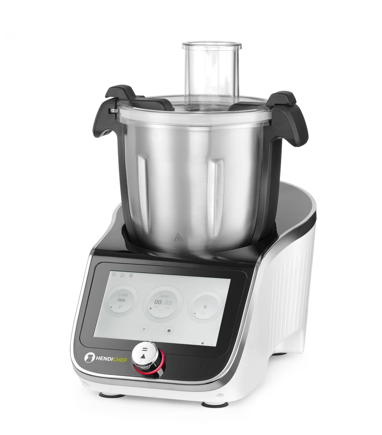Multifunkční robot HendiChef. Mísa o objemu 4,5 litru. 2 USB vstupy pro nahrávání receptůós. Časovač od 0-90 min. Teplotní rozsah od 37 stupňů;C do 130 stupňů;C. Ovládání otáčení míchadla ve 12 stupníchóstupních. 20 funkcí : vaření, drcení, míchání, hnětení, vaření v páře atd.