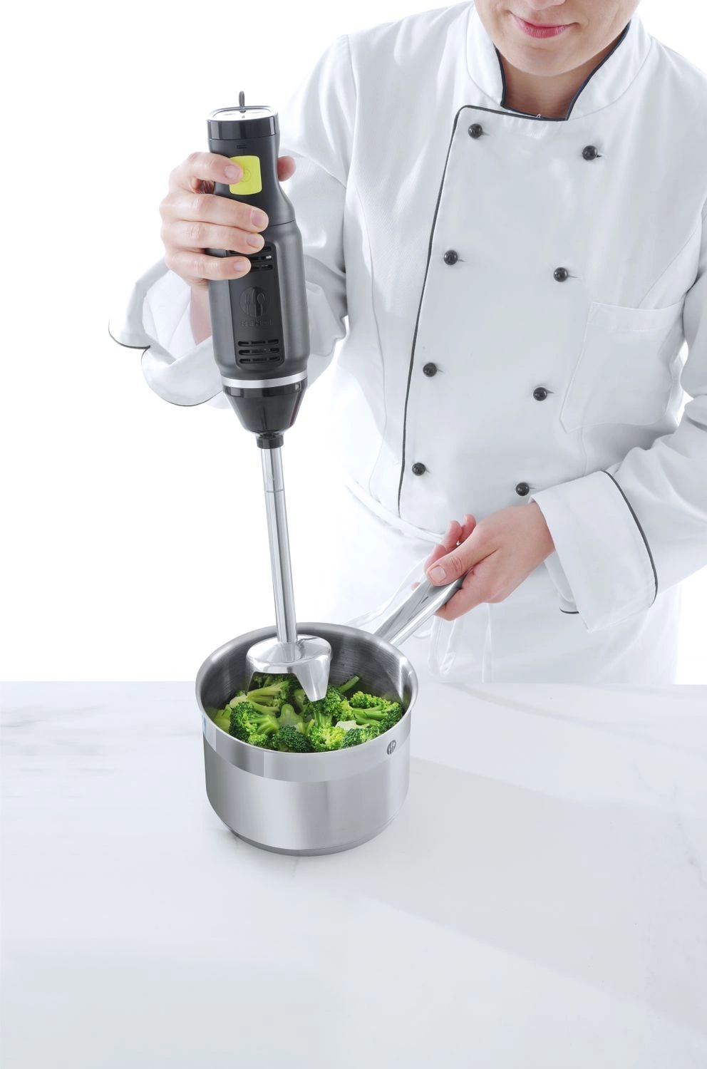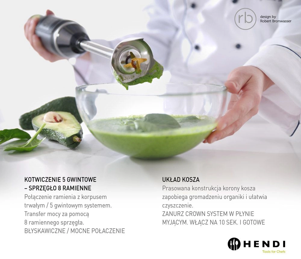 Ruční mixér s maximálními otáčkami 16000 ot/min. Pouzdro je vyrobeno z plastu ABS, rameno z nerezové oceli. Zkřížený nůž z nerezové oceli s titanem. Výkonný motor o příkonu 250 W. Mixér má elektronický ovládací panel s LED displejem - 6 rychlostí. Vhodný pro hrnce a pánve od 1 do 4 litrůów.